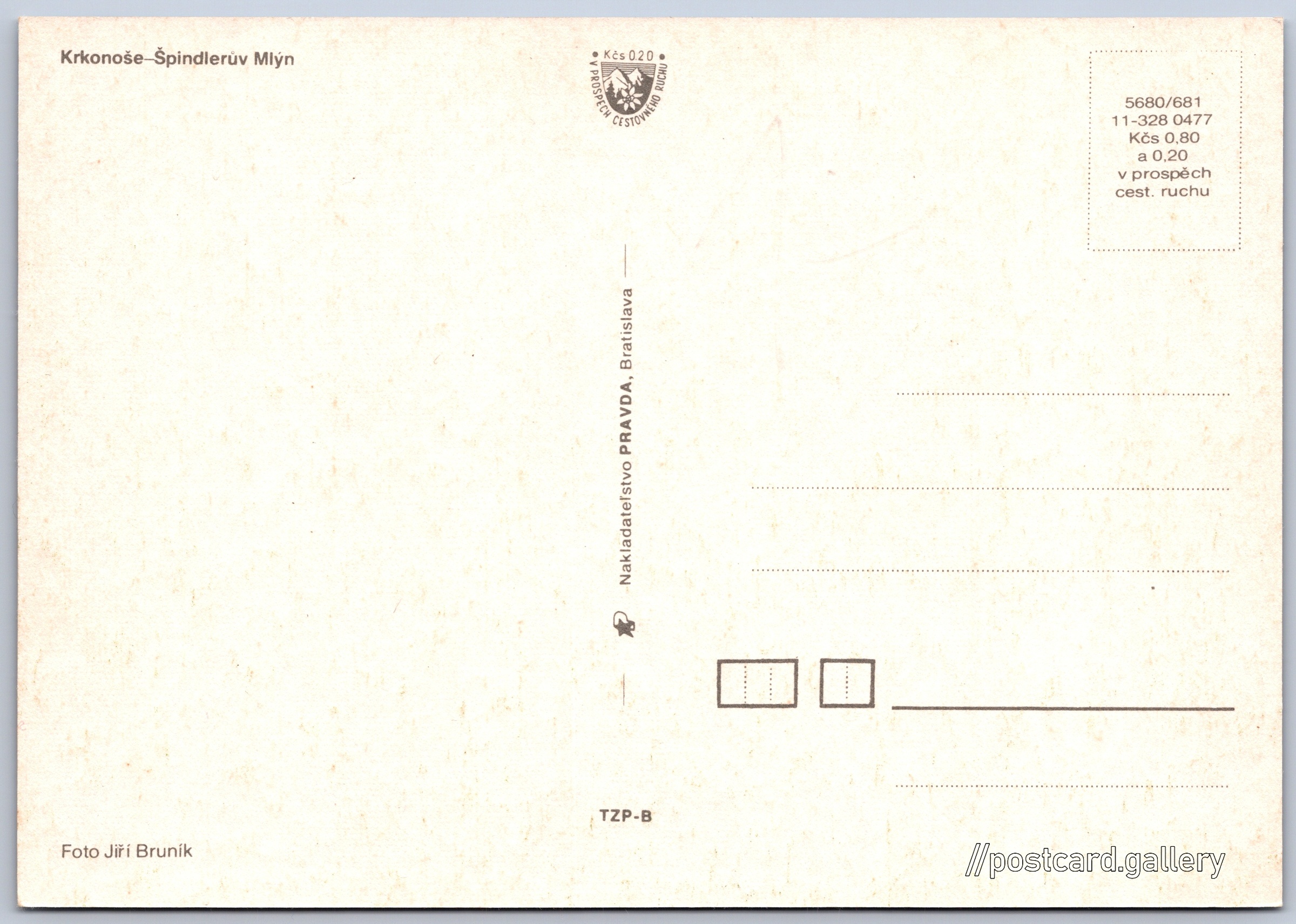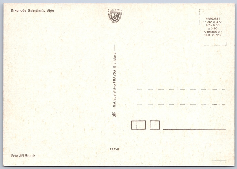 Krkonoše, Špindlerův Mlýn Pokud chcete vidět pohlednice ve vyšším rozlišení nebo zobrazovat jejich zadní stranu, tak se prosím nejdříve přihlašte Přihlásit Zaregistrovat Krkonoše - Špindlerův Mlýn Jazyk tištěného textu na pohlednici: čeština Špindlerův Mlýn, Trutnov ukázat na mapě V blízkém okolí místa zobrazeného na pohlednici lze najít 28 jiných pohlednic. Zobrazit blízké pohlednice Vydavatel: Nakladateľstvo PRAVDA, Bratislava (Československo) Rok vydání pohlednice: duben, 1977 Velikost (š x v) a tvar pohlednice: 149 x 104 mm (5.87" x 4.09"), obdélník Osoby spjaté s touto pohlednicí: Jiří Bruník(Autor fotografie) Čistá pohlednice (neprošlá poštou) Ceny: Cena pohlednice: 0,80 Kčs (CSK) (+0,20 Kčs přípl. na tur. ruch) Kódy na pohlednici: 5680/681 11-328 0477 DiskuseVložit příspěvek Přidat novou složku ... Spravovat složky ...