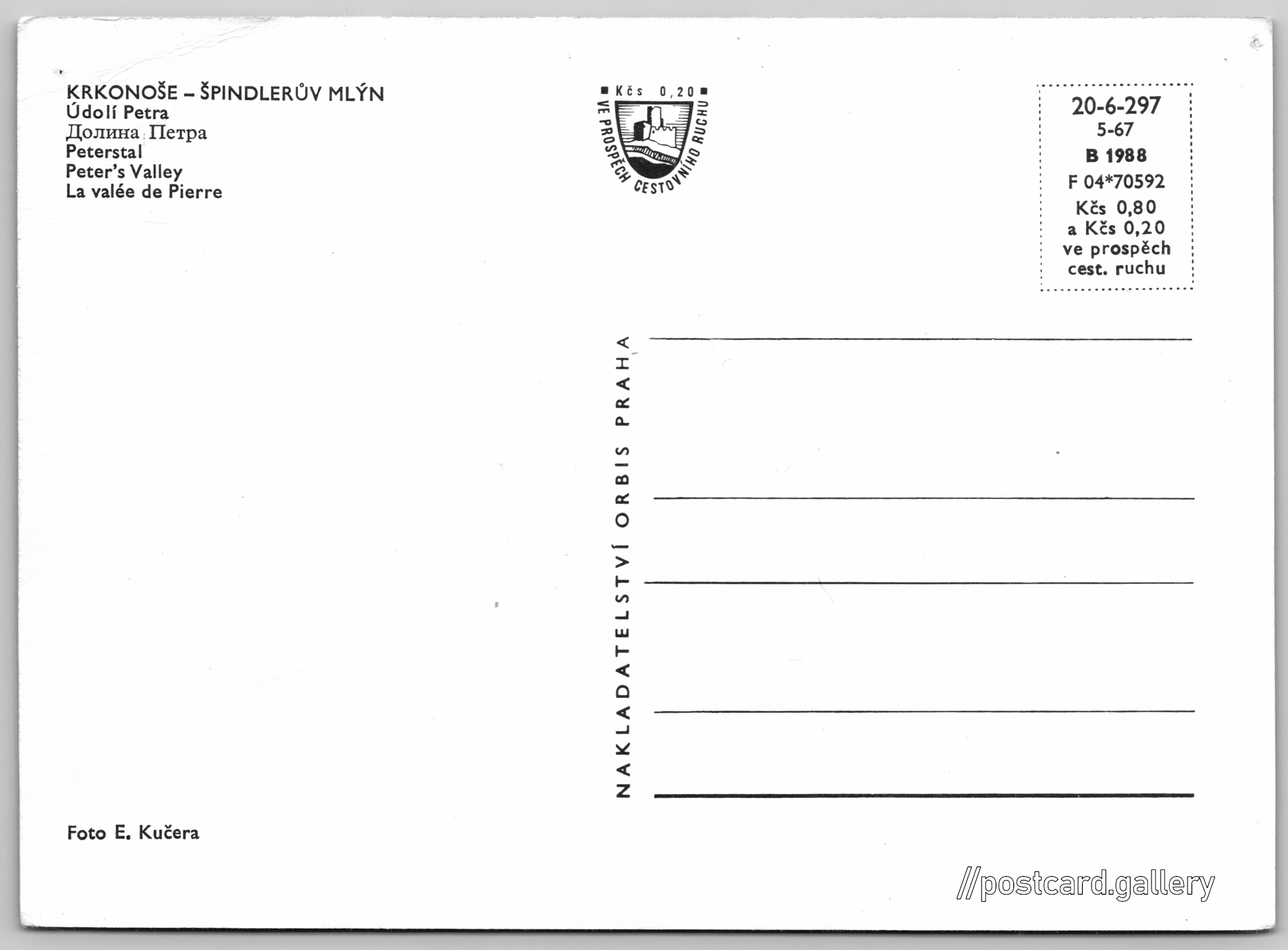 Krkonoše, údolí Petra 5/5 Pokud chcete vidět pohlednice ve vyšším rozlišení nebo zobrazovat jejich zadní stranu, tak se prosím nejdříve přihlašte Přihlásit Zaregistrovat KRKONOŠE - ŠPINDLERŮV MLÝN- Údolí Petra- Долина Петра- Peterstal- Peter's Valley- La valée de Pierre Jazyky tištěného textu na pohlednici: čeština, ruština, němčina, angličtina, francouzština Špindlerův Mlýn, Trutnov ukázat na mapě Vydavatel: Nakladatelství Orbis (Československo) Rok vydání pohlednice: květen, 1967 Velikost (š x v) a tvar pohlednice: 145 x 105 mm (5.71" x 4.13"), obdélník Osoby spjaté s touto pohlednicí: Eman Kučera(Autor fotografie) Čistá pohlednice (neprošlá poštou) Ceny: Cena pohlednice: 0,80 Kčs (CSK) (+0,20 Kčs přípl. na tur. ruch) Kódy na pohlednici: 20-6-297 5-67 B 1988 F 04*70592 DiskuseVložit příspěvek Přidat novou složku ... Spravovat složky ...