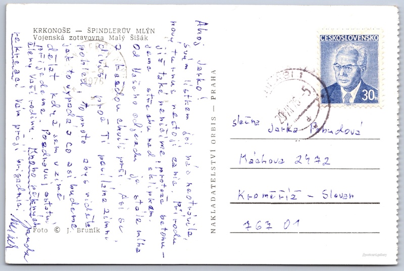 Krkonoše, vojenská zotavovna Malý Šišák Pokud chcete vidět pohlednice ve vyšším rozlišení nebo zobrazovat jejich zadní stranu, tak se prosím nejdříve přihlašte Přihlásit Zaregistrovat KRKONOŠE - ŠPINDLERŮV MLÝNVojenská zotavovna Malý Šišák Jazyk tištěného textu na pohlednici: čeština Volareza - penzion Malý Šišák**, Špindlerův Mlýn, Špindlerův Mlýn, Česko ukázat na mapě V blízkém okolí místa zobrazeného na pohlednici lze najít 30 jiných pohlednic. Zobrazit blízké pohlednice Vydavatel: Nakladatelství Orbis (Československo) Odhadované datum vydání pohlednice: 1973 - 1976 Pomozte nám zpřesnit rok vzniku pohlednice Velikost (š x v) a tvar pohlednice: 130 x 86 mm (5.12" x 3.39"), obdélník Osoby spjaté s touto pohlednicí: Jiří Bruník(Autor fotografie) Prošlá poštou:Datum na razítku: 29.7.1976 Ceny: Vyplacené známky: 0,30 Kčs (CSK) DiskuseVložit příspěvek Přidat novou složku ... Spravovat složky ...