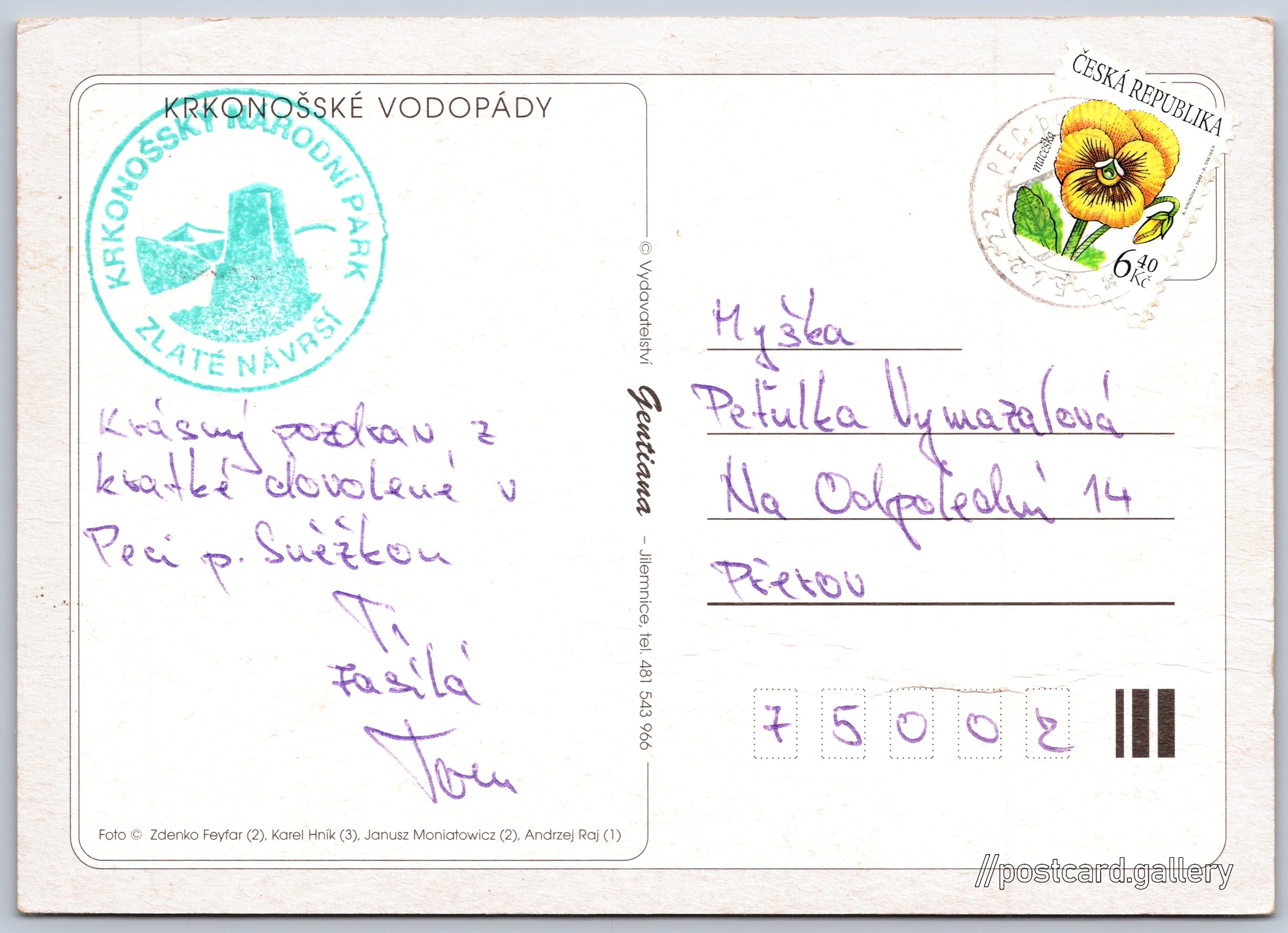 Krkonošské vodopády Pokud chcete vidět pohlednice ve vyšším rozlišení nebo zobrazovat jejich zadní stranu, tak se prosím nejdříve přihlašte Přihlásit Zaregistrovat Krkonošské vodopády- Pudlavský vodopád- Wodospad Kamieńczyka- Pančavský vodopád- Huťský vodopád- Labský vodopád- Wodospad Łomniczki- Wodospad Szklarki- Mumlavský vodopád KRKONOŠSKÉ VODOPÁDY Jazyk tištěného textu na pohlednici: čeština Pudlavský vodopád, Vodopád, Špindlerův Mlýn - Bedřichov, Česko ukázat na mapě Vydavatel: Vydavatelství Gentiana (Česko) Odhadované datum vydání pohlednice: 1999 - 2002 Pomozte nám zpřesnit rok vzniku pohlednice Velikost (š x v) a tvar pohlednice: 147 x 105 mm (5.79" x 4.13"), obdélník Osoby spjaté s touto pohlednicí: Zdenko Feyfar(Autor fotografie) Karel Hník(Autor fotografie) Andrzej Raj(Autor fotografie) Janusz Moniatowicz(Autor fotografie) Prošlá poštou Ceny: Vyplacené známky: 6,40 Kč (CZK) DiskuseVložit příspěvek Přidat novou složku ... Spravovat složky ...