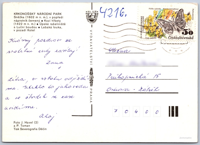 Krkonošský národní park 10/20 Pokud chcete vidět pohlednice ve vyšším rozlišení nebo zobrazovat jejich zadní stranu, tak se prosím nejdříve přihlašte Přihlásit Zaregistrovat Krkonošský národní park KRKONOŠSKÝ NÁRODNÍ PARK- Sněžka (1602 m n. m.), v popředí náprstník červený- Kozí hřbety (1422 m n. m.).- Úpské rašeliniště s Luční boudou- Labská louka, v pozadí Kotel Jazyk tištěného textu na pohlednici: čeština Kozí hřbety, Horský hřbet, plošina, stráň, Špindlerův Mlýn, Česko ukázat na mapě Vydavatel: PressFoto Praha (Československo) Odhadované datum vydání pohlednice: 1980 - 1983 Pomozte nám zpřesnit rok vzniku pohlednice Velikost (š x v) a tvar pohlednice: 148 x 106 mm (5.83" x 4.17"), obdélník Osoby spjaté s touto pohlednicí: Ing. Jiří Havel(Autor fotografie) Petr Toman(Autor fotografie) Prošlá poštou:Datum na razítku: 29.8.1983 Ceny: Příplatek na tur. ruch: 0,20 Kčs (CSK))Vyplacené známky: 0,50 Kčs (CSK) DiskuseVložit příspěvek Přidat novou složku ... Spravovat složky ...