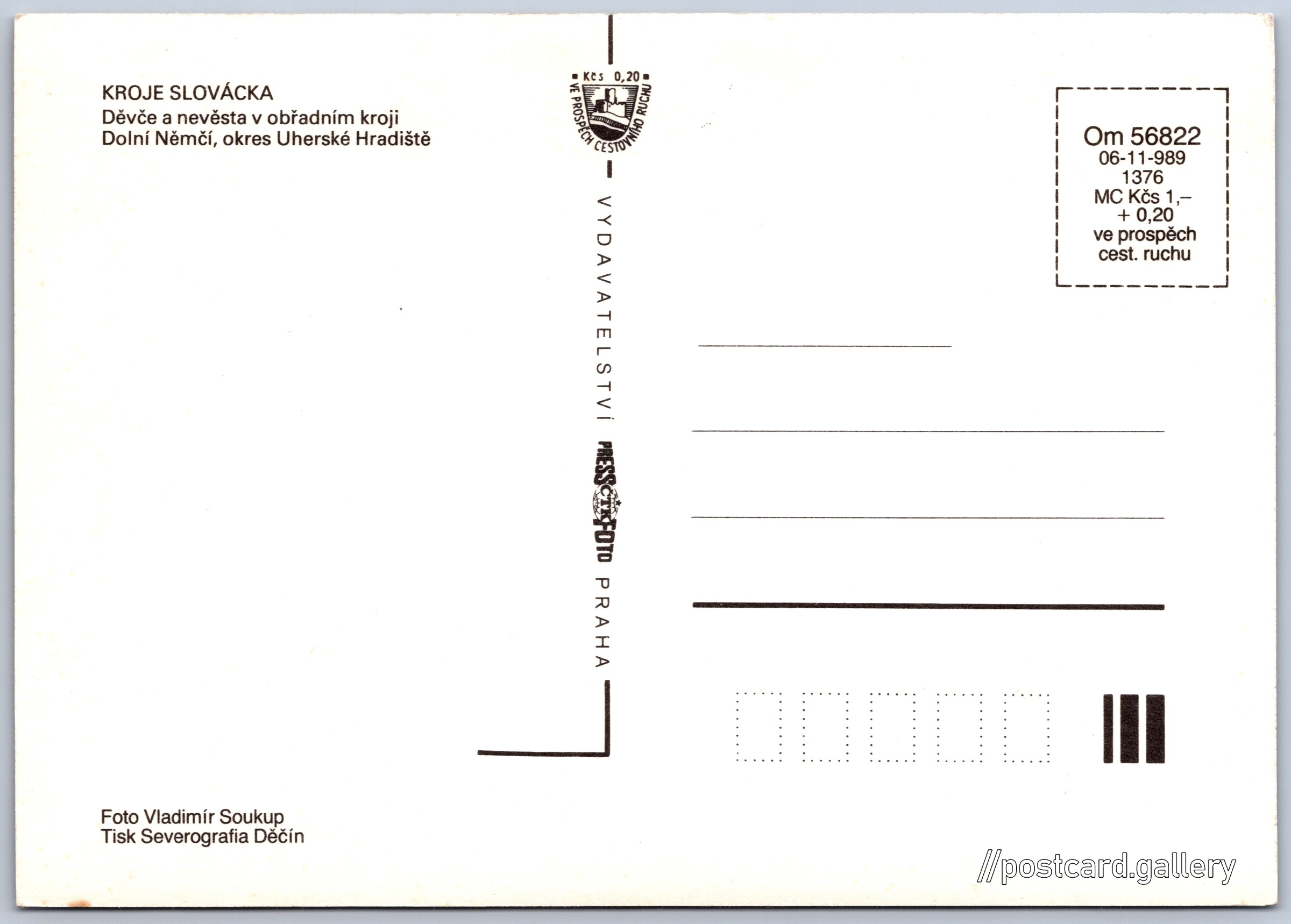 Kroje Slovácka, Dolní Němčí 3/28 Pokud chcete vidět pohlednice ve vyšším rozlišení nebo zobrazovat jejich zadní stranu, tak se prosím nejdříve přihlašte Přihlásit Zaregistrovat KROJE SLOVÁCKADěvče a nevěsta v obřadním krojiDolní Němčí, okres Uherské Hradiště Jazyk tištěného textu na pohlednici: čeština Dolní Němčí, Obec, Česko ukázat na mapě Vydavatel: PressFoto Praha (Československo) Rok vydání pohlednice: 1989 Velikost (š x v) a tvar pohlednice: 148 x 105 mm (5.83" x 4.13"), obdélník Osoby spjaté s touto pohlednicí: Vladimír Soukup(Autor fotografie) Čistá pohlednice (neprošlá poštou) Ceny: Cena pohlednice: 1,00 Kčs (CSK) (+0,20 Kčs přípl. na tur. ruch) Kódy na pohlednici: Om 56822 06-11-989 1376 DiskuseVložit příspěvek Přidat novou složku ... Spravovat složky ...