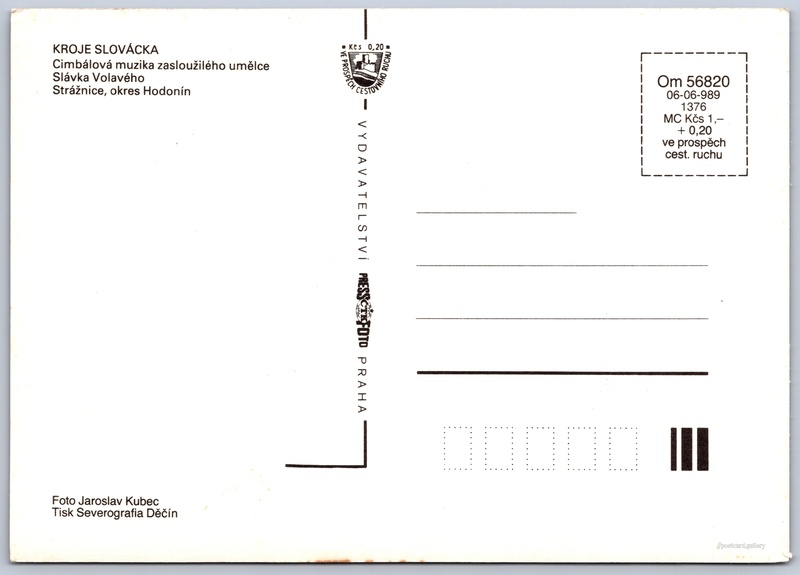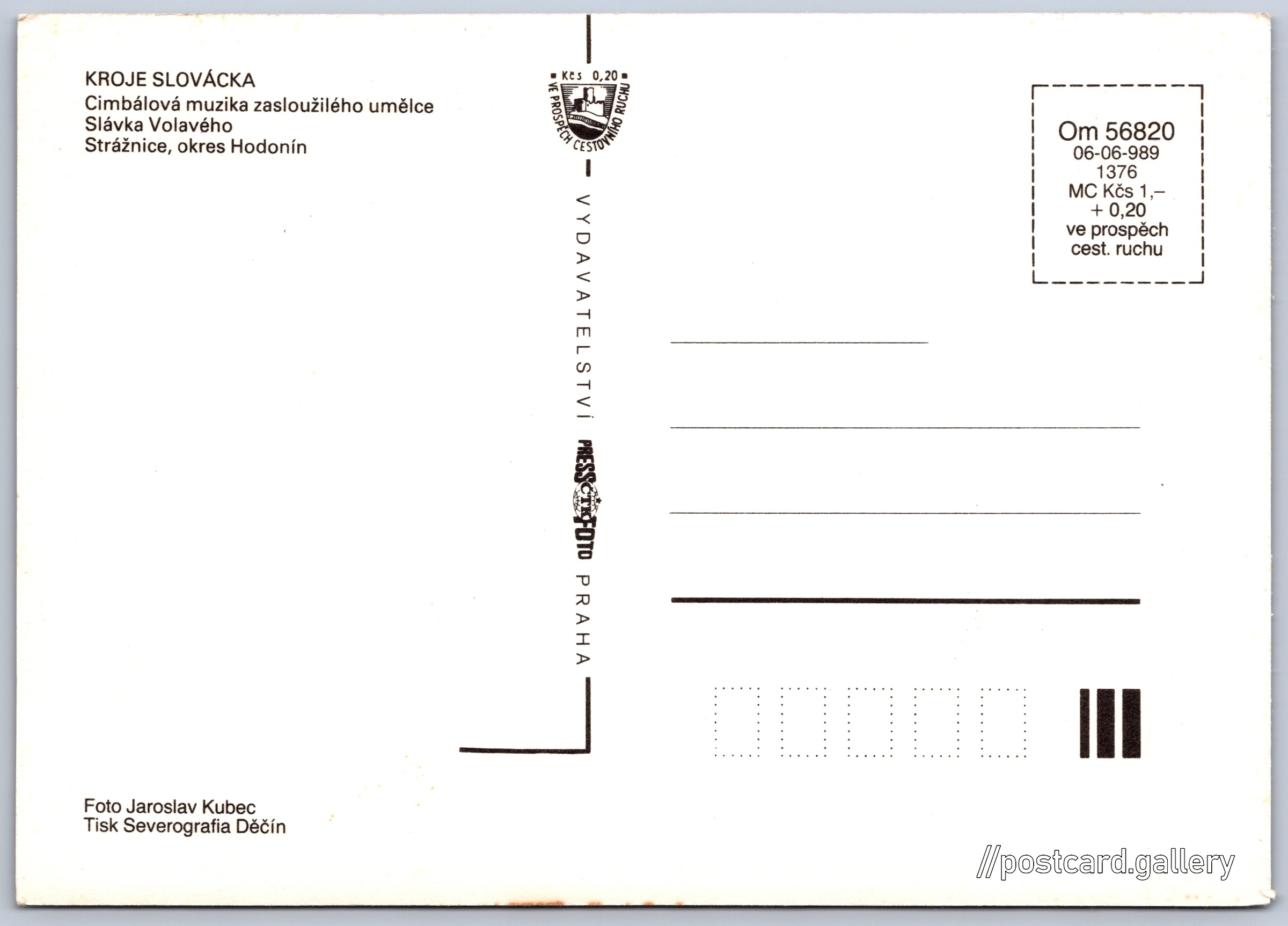 Kroje Slovácka, Strážnice Pokud chcete vidět pohlednice ve vyšším rozlišení nebo zobrazovat jejich zadní stranu, tak se prosím nejdříve přihlašte Přihlásit Zaregistrovat KROJE SLOVÁCKACimbálová muzika zasloužilého umělce Slávka VolavéhoStrážnice, okres Hodonín Jazyk tištěného textu na pohlednici: čeština Strážnice, Město, Česko ukázat na mapě V blízkém okolí místa zobrazeného na pohlednici lze najít 1 jinou pohlednici. Zobrazit blízké pohlednice Vydavatel: PressFoto Praha (Československo) Rok vydání pohlednice: 1989 Velikost (š x v) a tvar pohlednice: 148 x 105 mm (5.83" x 4.13"), obdélník Osoby spjaté s touto pohlednicí: Jaroslav Kubec(Autor fotografie) Slávek Volavý(Obsah pohlednice) Čistá pohlednice (neprošlá poštou) Ceny: Cena pohlednice: 1,00 Kčs (CSK) (+0,20 Kčs přípl. na tur. ruch) Kódy na pohlednici: Om 56820 06-06-989 1376 DiskuseVložit příspěvek Přidat novou složku ... Spravovat složky ...
