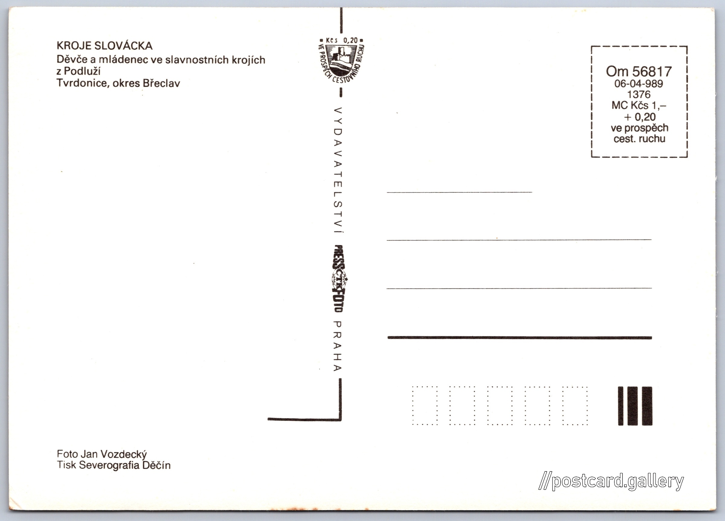 Kroje Slovácka, Tvrdonice 3/3 Pokud chcete vidět pohlednice ve vyšším rozlišení nebo zobrazovat jejich zadní stranu, tak se prosím nejdříve přihlašte Přihlásit Zaregistrovat KROJE SLOVÁCKADěvče a mládenec ve slavnostních krojích z PodlužíTvrdonice, okres Břeclav Jazyk tištěného textu na pohlednici: čeština Tvrdonice, Obec, Česko ukázat na mapě V blízkém okolí místa zobrazeného na pohlednici lze najít 4 jiné pohlednice. Zobrazit blízké pohlednice Vydavatel: PressFoto Praha (Československo) Rok vydání pohlednice: 1989 Velikost (š x v) a tvar pohlednice: 148 x 105 mm (5.83" x 4.13"), obdélník Osoby spjaté s touto pohlednicí: Jan Vozdecký(Autor fotografie) Čistá pohlednice (neprošlá poštou) Ceny: Cena pohlednice: 1,00 Kčs (CSK) (+0,20 Kčs přípl. na tur. ruch) Kódy na pohlednici: Om 56817 06-04-989 1376 DiskuseVložit příspěvek Přidat novou složku ... Spravovat složky ...