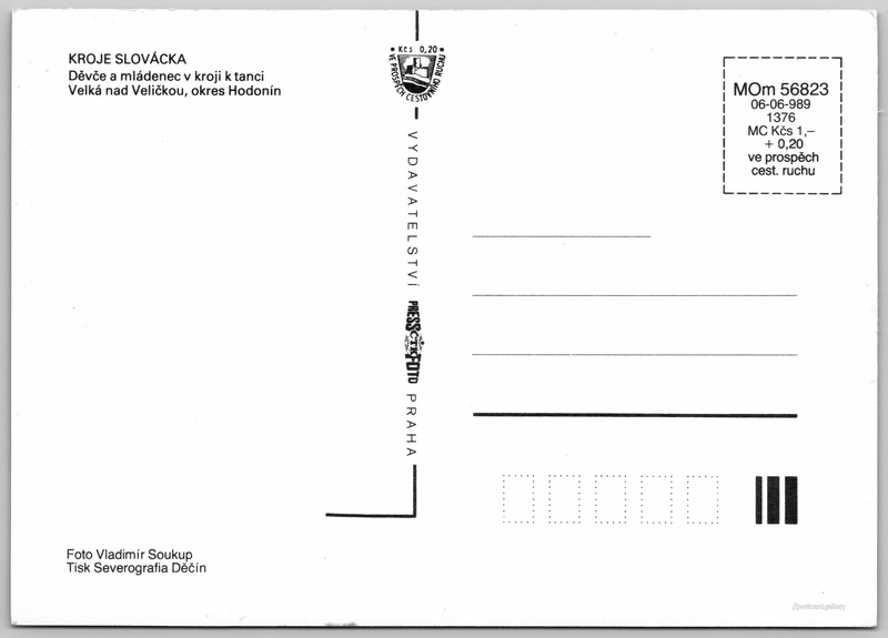Kroje Slovácka, Velká nad Veličkou Pokud chcete vidět pohlednice ve vyšším rozlišení nebo zobrazovat jejich zadní stranu, tak se prosím nejdříve přihlašte Přihlásit Zaregistrovat KROJE SLOVÁCKADěvče a mládenec v kroji k tanciVelká nad Veličkou, okres Hodonín Jazyk tištěného textu na pohlednici: čeština Velká nad Veličkou, Obec, Česko ukázat na mapě Vydavatel: PressFoto Praha (Československo) Rok vydání pohlednice: 1989 Velikost (š x v) a tvar pohlednice: 148 x 105 mm (5.83" x 4.13"), obdélník Osoby spjaté s touto pohlednicí: Vladimír Soukup(Autor fotografie) Čistá pohlednice (neprošlá poštou) Ceny: Cena pohlednice: 1,00 Kčs (CSK) (+0,20 Kčs přípl. na tur. ruch) Kódy na pohlednici: MOm 56823 06-06-989 1376 DiskuseVložit příspěvek Přidat novou složku ... Spravovat složky ...