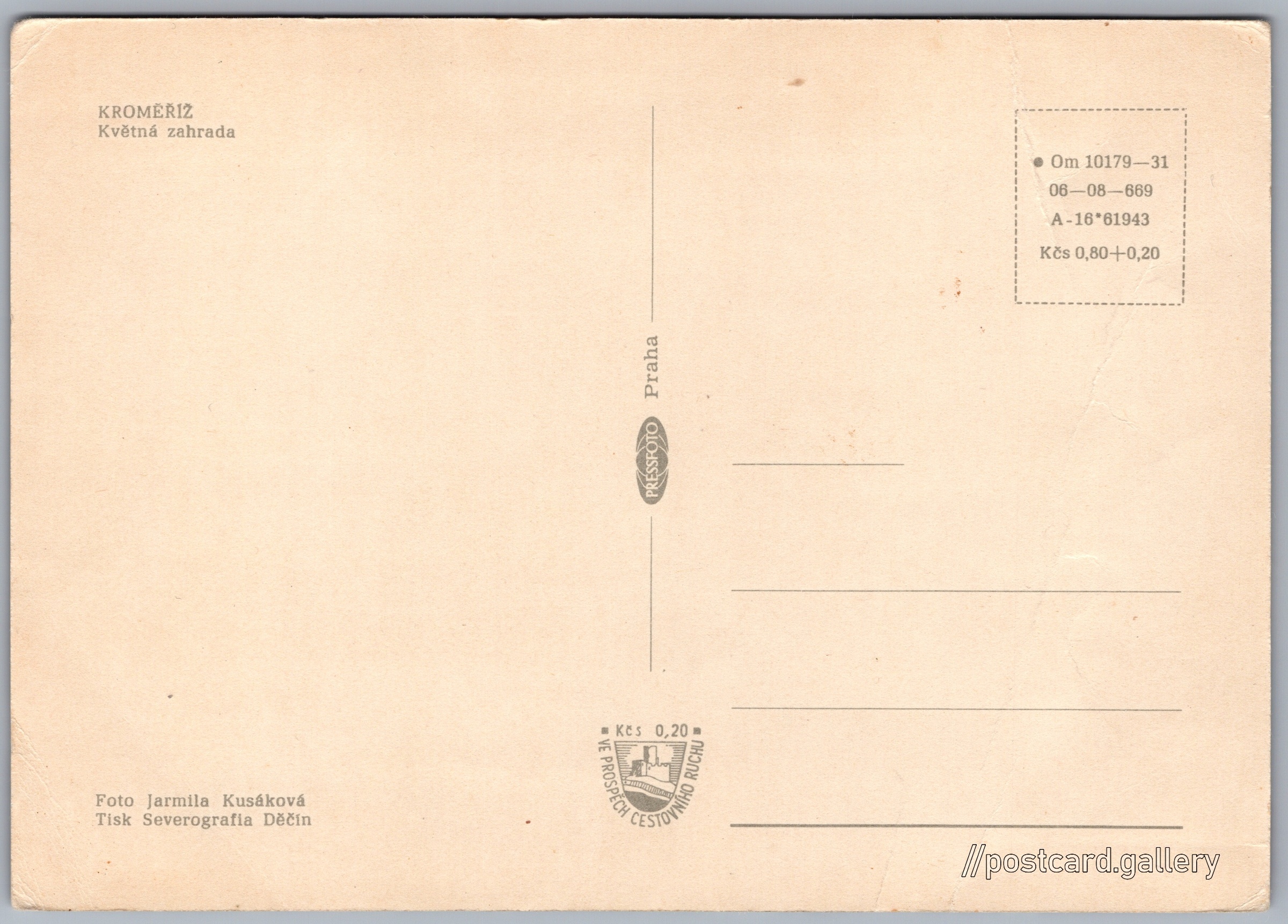 Cena pohlednice: 0,80 Kčs (CSK) (+0,20 Kčs přípl. na tur. ruch)