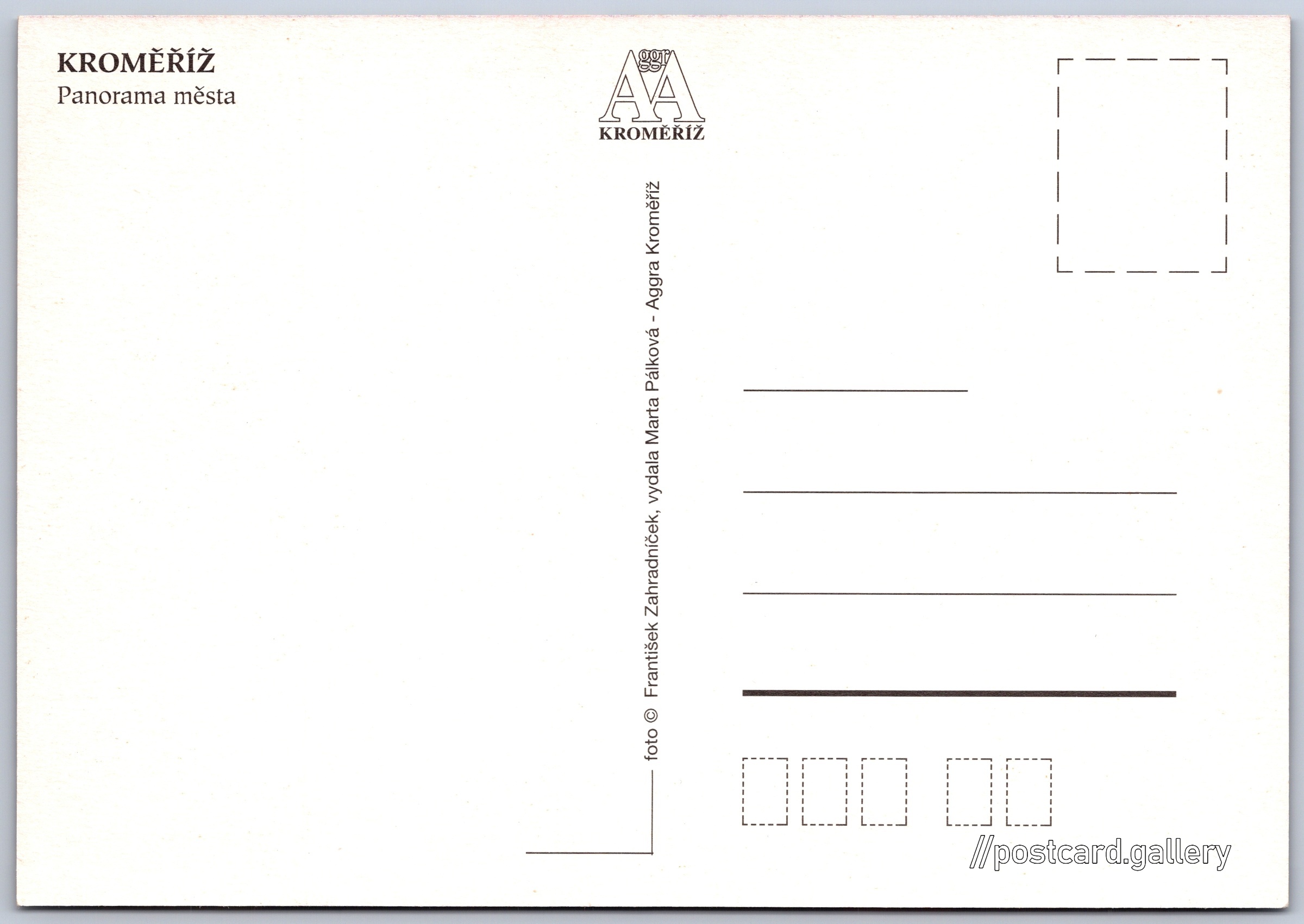 Kroměříž, panoráma města Pokud chcete vidět pohlednice ve vyšším rozlišení nebo zobrazovat jejich zadní stranu, tak se prosím nejdříve přihlašte Přihlásit Zaregistrovat KROMĚŘÍŽPanorama města Jazyk tištěného textu na pohlednici: čeština Kroměříž, Kroměříž ukázat na mapě V blízkém okolí místa zobrazeného na pohlednici lze najít 20 jiných pohlednic. Zobrazit blízké pohlednice Vydavatel: Malý nakladatel (Česko) Datum vydání není známo Pomozte nám odhadnout datum vzniku pohlednice Velikost (š x v) a tvar pohlednice: 150 x 105 mm (5.91" x 4.13"), obdélník Osoby spjaté s touto pohlednicí: František Zahradníček(Autor fotografie) Čistá pohlednice (neprošlá poštou) DiskuseVložit příspěvek Přidat novou složku ... Spravovat složky ...