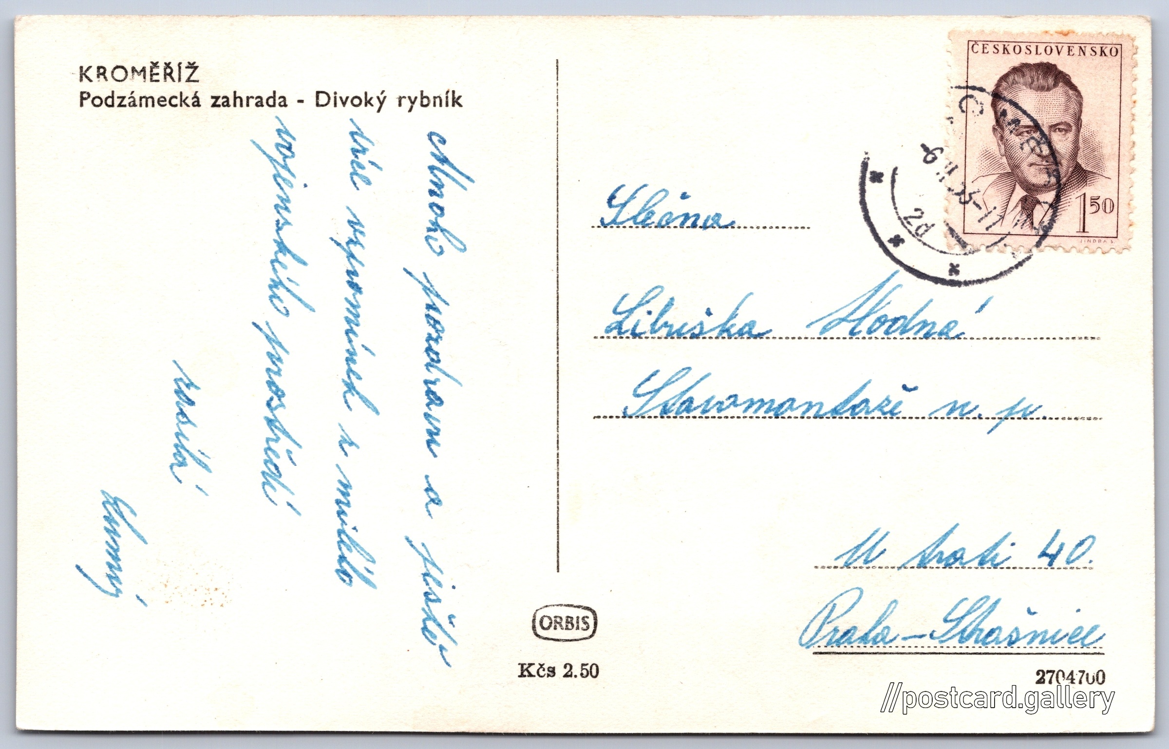 Kroměříž, podzámecká zahrada, Divoký rybník 1/20 Pokud chcete vidět pohlednice ve vyšším rozlišení nebo zobrazovat jejich zadní stranu, tak se prosím nejdříve přihlašte Přihlásit Zaregistrovat KROMĚŘÍŽPodzámecká zahrada - Divoký rybník Jazyk tištěného textu na pohlednici: čeština Kroměříž, Kroměříž ukázat na mapě V blízkém okolí místa zobrazeného na pohlednici lze najít 20 jiných pohlednic. Zobrazit blízké pohlednice Vydavatel: Nakladatelství Orbis (Československo) Odhadované datum vydání pohlednice: 1950 - 1953 Pomozte nám zpřesnit rok vzniku pohlednice Velikost (š x v) a tvar pohlednice: 139 x 88 mm (5.47" x 3.46"), obdélník Prošlá poštou:Datum na razítku: 6.2.1953 Ceny: Cena pohlednice: 2,50 Kčs (CSK)Vyplacené známky: 1,50 Kčs (CSK) Kódy na pohlednici: 2704700 DiskuseVložit příspěvek Přidat novou složku ... Spravovat složky ...