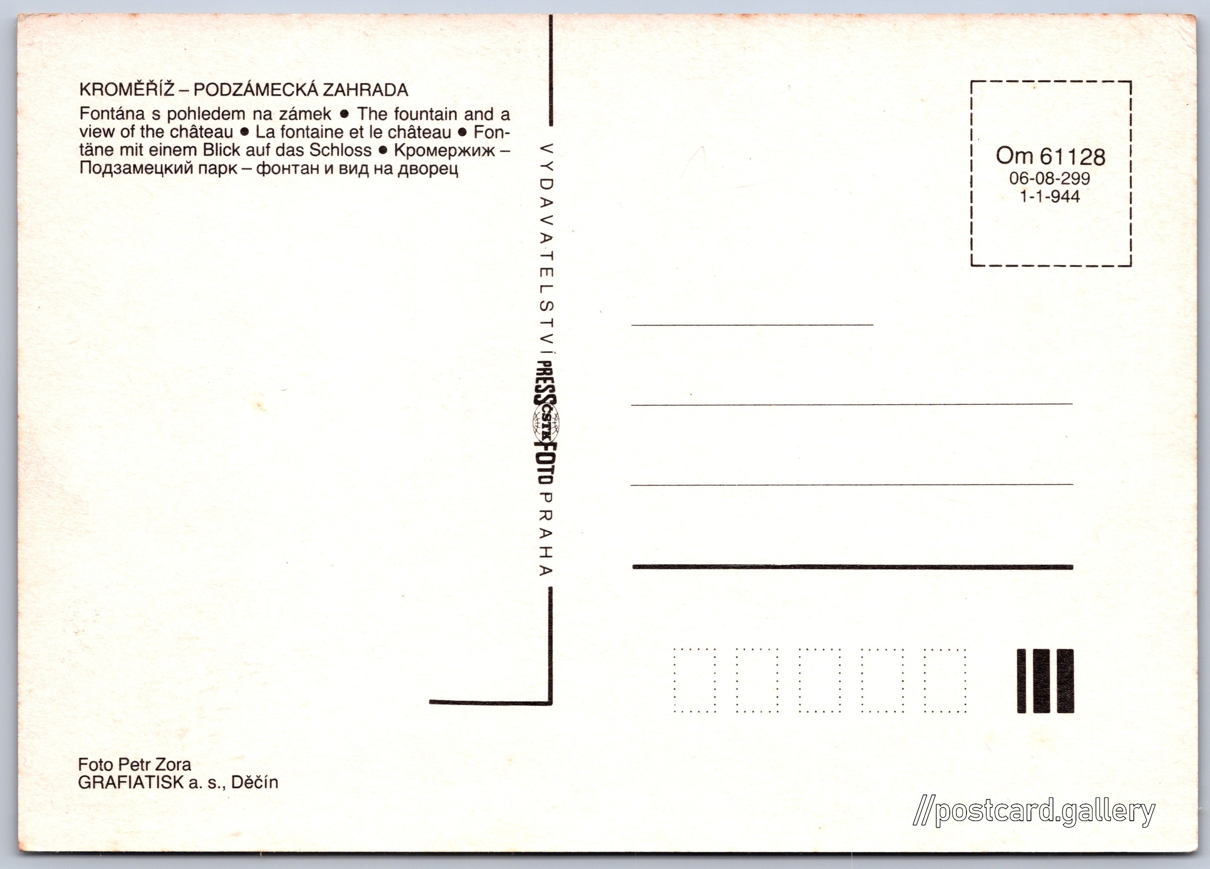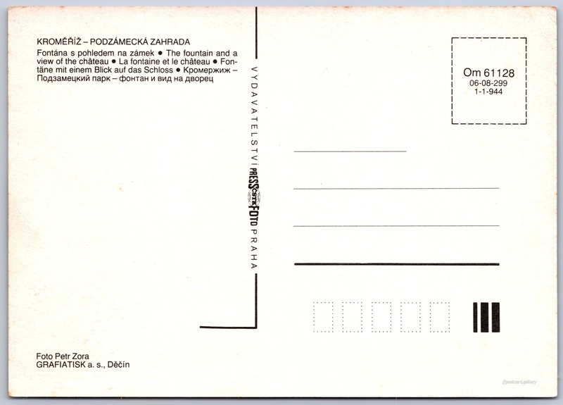 Kroměříž, podzámecká zahrada Pokud chcete vidět pohlednice ve vyšším rozlišení nebo zobrazovat jejich zadní stranu, tak se prosím nejdříve přihlašte Přihlásit Zaregistrovat KROMĚŘÍŽ - PODZÁMECKÁ ZAHRADA- Fontána s pohledem na zámek- The fountain and a view of the château- La fontaine et le château- Fontäne mit einem Blick auf das Schloss- Kpoмержиж - - Подзамецкий парк - фонтан и вид на дворец Jazyk tištěného textu na pohlednici: čeština Kroměříž, Kroměříž ukázat na mapě V blízkém okolí místa zobrazeného na pohlednici lze najít 20 jiných pohlednic. Zobrazit blízké pohlednice Vydavatel: PressFoto Praha (Československo) Rok vydání pohlednice: 1992 Velikost (š x v) a tvar pohlednice: 148 x 105 mm (5.83" x 4.13"), obdélník Osoby spjaté s touto pohlednicí: Petr Zora(Autor fotografie) Čistá pohlednice (neprošlá poštou) Kódy na pohlednici: Om 61128 06-08-299 1-1-944 DiskuseVložit příspěvek Přidat novou složku ... Spravovat složky ...