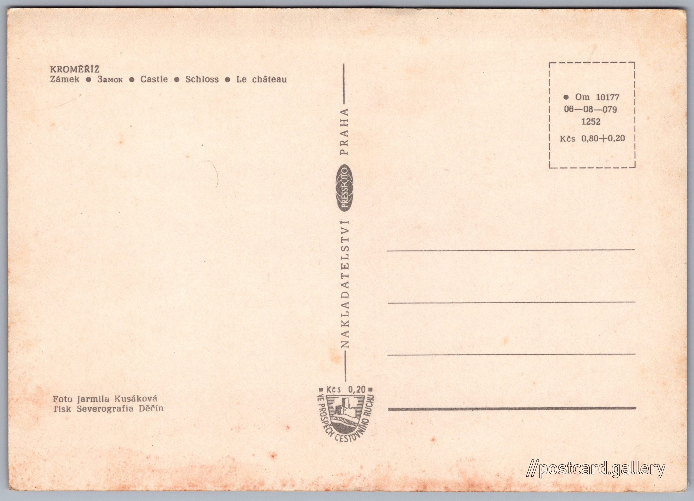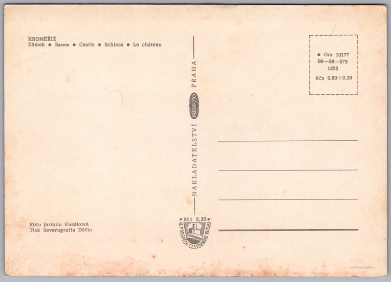 Kroměříž, zámek Pokud chcete vidět pohlednice ve vyšším rozlišení nebo zobrazovat jejich zadní stranu, tak se prosím nejdříve přihlašte Přihlásit Zaregistrovat KROMĚŘÍŽ- Zámek- 3амок- Castle- Schloss- Le château Jazyk tištěného textu na pohlednici: čeština Arcibiskupský zámek Kroměříž, Zámek, Kroměříž, Česko ukázat na mapě V blízkém okolí místa zobrazeného na pohlednici lze najít 20 jiných pohlednic. Zobrazit blízké pohlednice Vydavatel: PressFoto Praha (Československo) Rok vydání pohlednice: 1970 Velikost (š x v) a tvar pohlednice: 148 x 105 mm (5.83" x 4.13"), obdélník Osoby spjaté s touto pohlednicí: Jarmila Kusáková(Autor fotografie) Čistá pohlednice (neprošlá poštou) Ceny: Cena pohlednice: 0,80 Kčs (CSK) (+0,20 Kčs přípl. na tur. ruch) Kódy na pohlednici: Om 10177 06-08-079 1252 DiskuseVložit příspěvek Přidat novou složku ... Spravovat složky ...