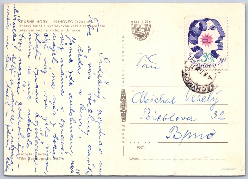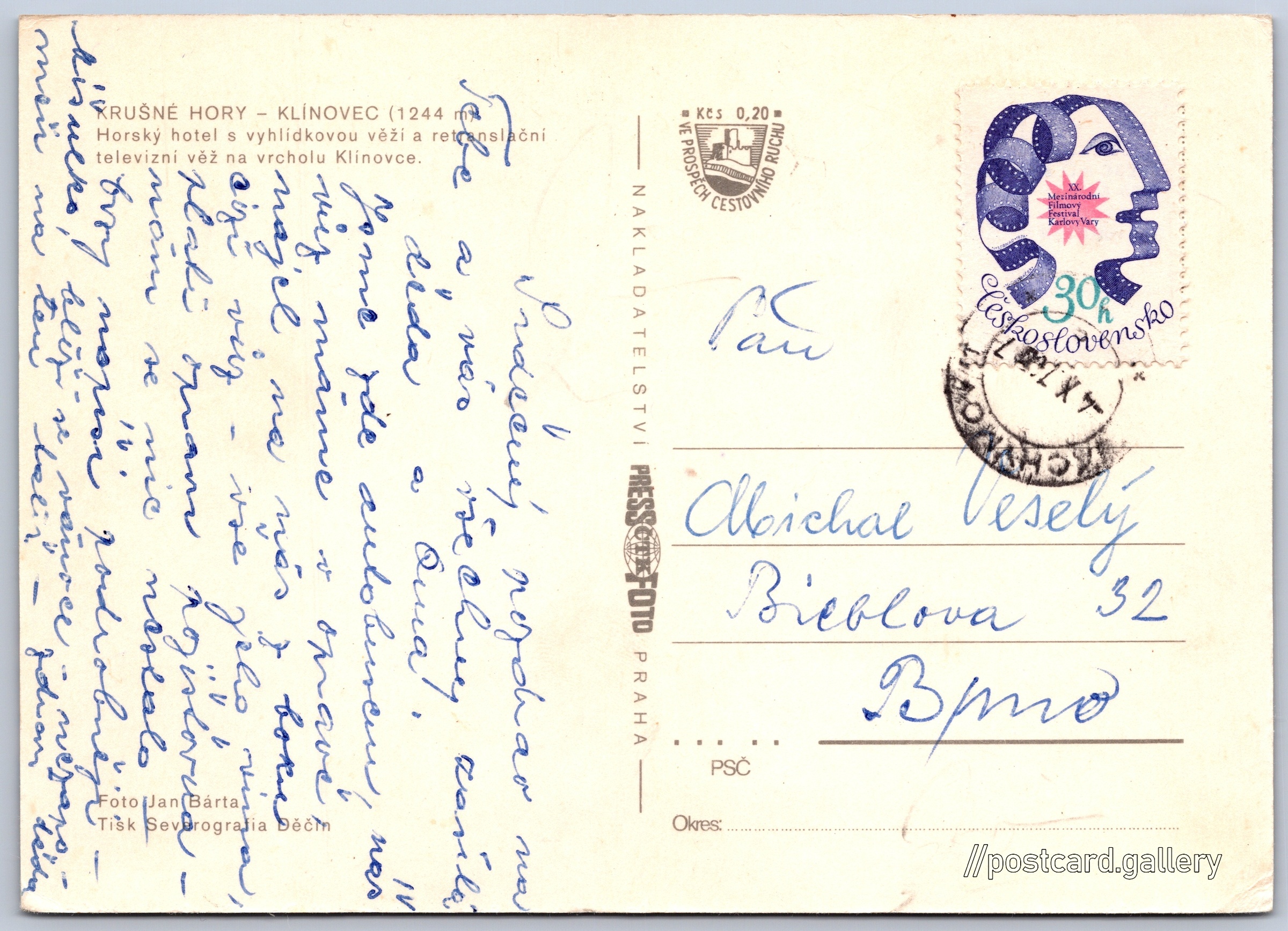 Krušné hory, Klínovec 7/11 Pokud chcete vidět pohlednice ve vyšším rozlišení nebo zobrazovat jejich zadní stranu, tak se prosím nejdříve přihlašte Přihlásit Zaregistrovat KRUŠNÉ HORY - KLÍNOVEC (1244 m)Horský hotel s vyhlídkovou věží a retranslační televizní věž na vrcholu Klínovce. Jazyk tištěného textu na pohlednici: čeština Jáchymov 1066, Jáchymov, 362 51, Karlovy Vary ukázat na mapě V blízkém okolí místa zobrazeného na pohlednici lze najít 11 jiných pohlednic. Zobrazit blízké pohlednice Vydavatel: PressFoto Praha (Československo) Datum vydání není známo Pomozte nám odhadnout datum vzniku pohlednice Velikost (š x v) a tvar pohlednice: 147 x 105 mm (5.79" x 4.13"), obdélník Osoby spjaté s touto pohlednicí: Jan Bárta(Autor fotografie) Prošlá poštou Ceny: Příplatek na tur. ruch: 0,20 Kčs (CSK))Vyplacené známky: 0,30 Kčs (CSK) DiskuseVložit příspěvek Přidat novou složku ... Spravovat složky ...