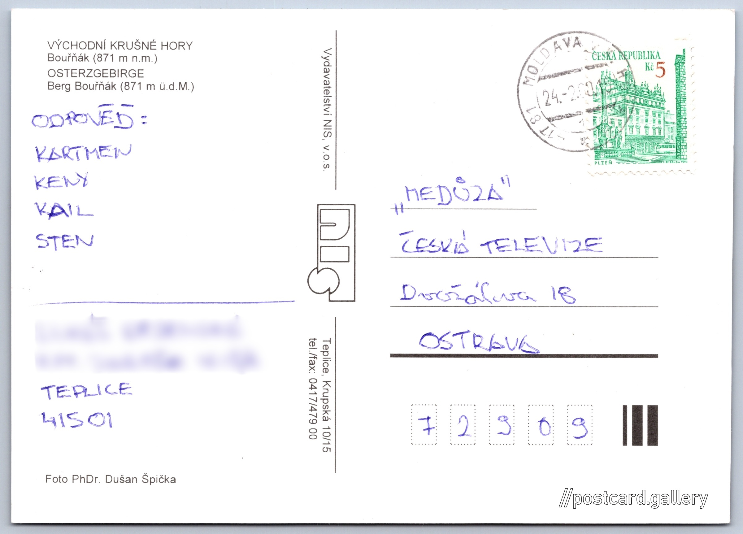 Krušné hory Pokud chcete vidět pohlednice ve vyšším rozlišení nebo zobrazovat jejich zadní stranu, tak se prosím nejdříve přihlašte Přihlásit Zaregistrovat Krušné hory VÝCHODNÍ KRUŠNÉ HORYBouřňák (871 m n.m.)OSTERZGEBIRGEBerg Bouřňák (871 m ü.d.M.) Jazyky tištěného textu na pohlednici: čeština, němčina Bouřňák (869 m), Hora, výškový bod, Moldava, Česko ukázat na mapě V blízkém okolí místa zobrazeného na pohlednici lze najít 1 jinou pohlednici. Zobrazit blízké pohlednice Vydavatel: Vydavatelství NIS, v.o.s. (Česko) Odhadované datum vydání pohlednice: 1997 - 2000 Pomozte nám zpřesnit rok vzniku pohlednice Velikost (š x v) a tvar pohlednice: 147 x 105 mm (5.79" x 4.13"), obdélník Osoby spjaté s touto pohlednicí: PhDr. Dušan Špička(Autor fotografie) Prošlá poštou:Datum na razítku: 24.2.2000 Ceny: Vyplacené známky: 5,00 Kč (CZK) DiskuseVložit příspěvek Přidat novou složku ... Spravovat složky ...
