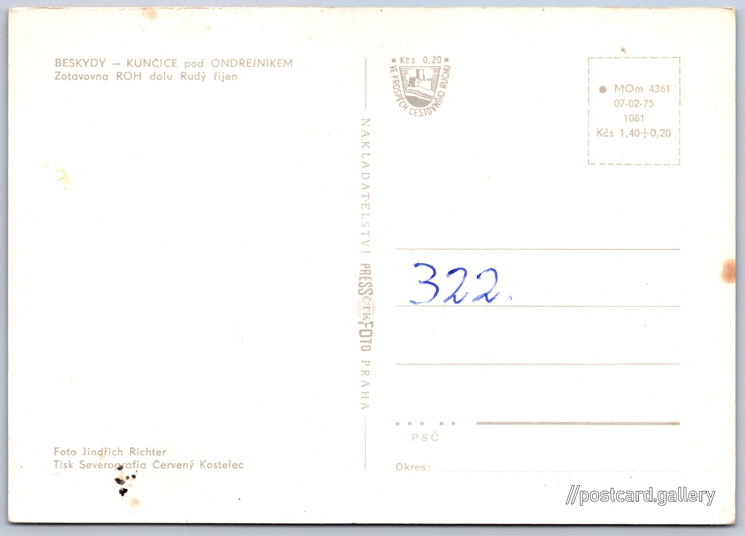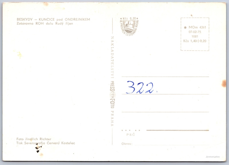 Kunčice pod Ondřejníkem, zotavovna Pokud chcete vidět pohlednice ve vyšším rozlišení nebo zobrazovat jejich zadní stranu, tak se prosím nejdříve přihlašte Přihlásit Zaregistrovat Kunčice pod OndřejníkemZotavovna ROH dolu Rudý říjen BESKYDY - KUNČICE pod ONDŘEJNÍKEMZotavovna ROH dolu Rudý říjen Jazyk tištěného textu na pohlednici: čeština Kunčice pod Ondřejníkem, Obec, Česko ukázat na mapě V blízkém okolí místa zobrazeného na pohlednici lze najít 8 jiných pohlednic. Zobrazit blízké pohlednice Vydavatel: PressFoto Praha (Československo) Datum vydání není známo Pomozte nám odhadnout datum vzniku pohlednice Velikost (š x v) a tvar pohlednice: 149 x 106 mm (5.87" x 4.17"), obdélník Osoby spjaté s touto pohlednicí: Jindřich Richter(Autor fotografie) Čistá pohlednice (neprošlá poštou) Ceny: Cena pohlednice: 1,40 Kčs (CSK) (+0,20 Kčs přípl. na tur. ruch) Kódy na pohlednici: MOm 4361 07-02-75 1081 DiskuseVložit příspěvek Přidat novou složku ... Spravovat složky ...