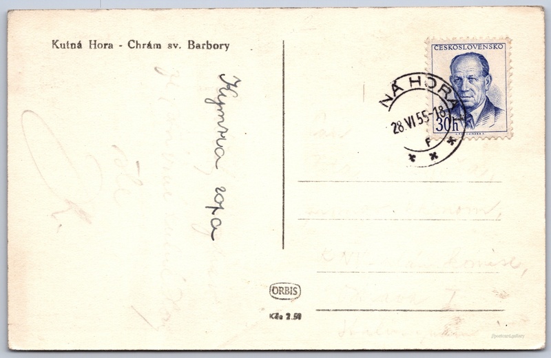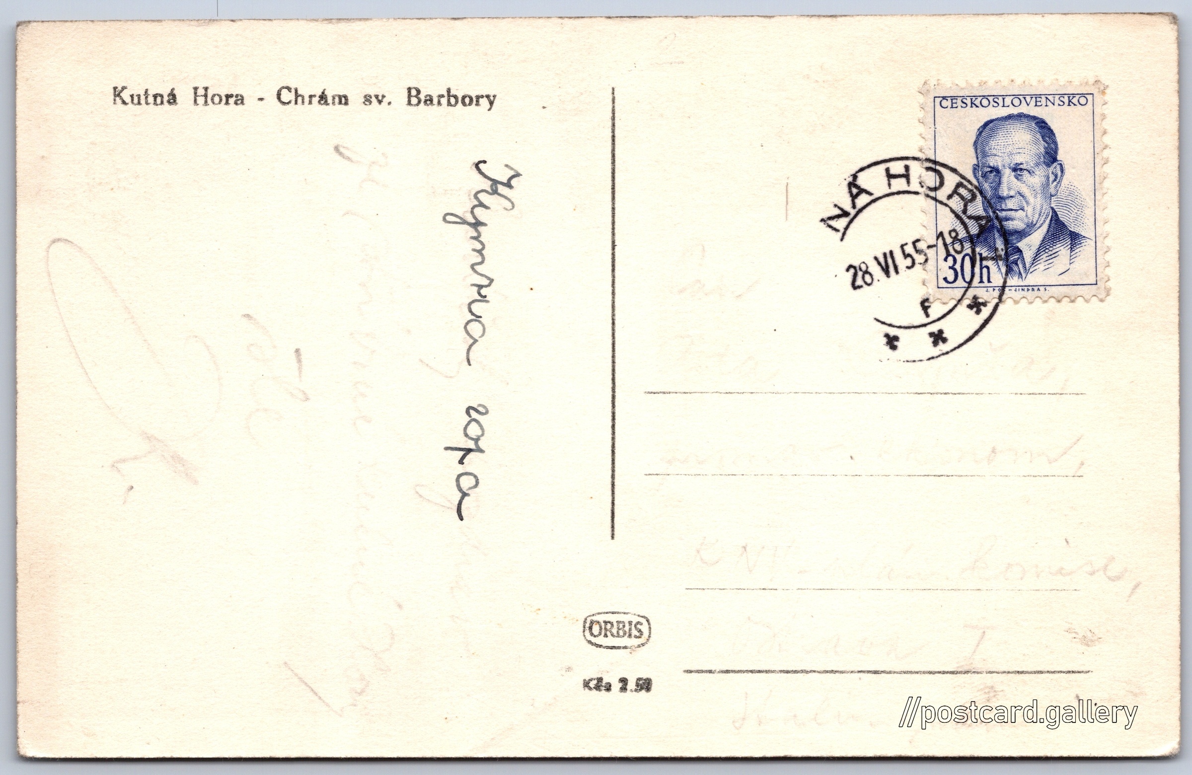 Kutná Hora, chrám sv. Barbory 8/22 Pokud chcete vidět pohlednice ve vyšším rozlišení nebo zobrazovat jejich zadní stranu, tak se prosím nejdříve přihlašte Přihlásit Zaregistrovat Kutná Hora - Chrám sv. Barbory Jazyk tištěného textu na pohlednici: čeština Památka UNESCO - Kutná Hora - historické centrum, Chrám sv. Barbory, Katedrála Nanebevzetí Panny Marie v Sedlci, Památka UNESCO, Kutná Hora-Vnitřní Město, Česko ukázat na mapě V blízkém okolí místa zobrazeného na pohlednici lze najít 22 jiných pohlednic. Zobrazit blízké pohlednice Vydavatel: Nakladatelství Orbis (Československo) Odhadované datum vydání pohlednice: 1952 - 1955 Pomozte nám zpřesnit rok vzniku pohlednice Velikost (š x v) a tvar pohlednice: 138 x 88 mm (5.43" x 3.46"), obdélník Prošlá poštou:Datum na razítku: 28.6.1955 Ceny: Vyplacené známky: 0,30 Kčs (CSK) DiskuseVložit příspěvek Přidat novou složku ... Spravovat složky ...