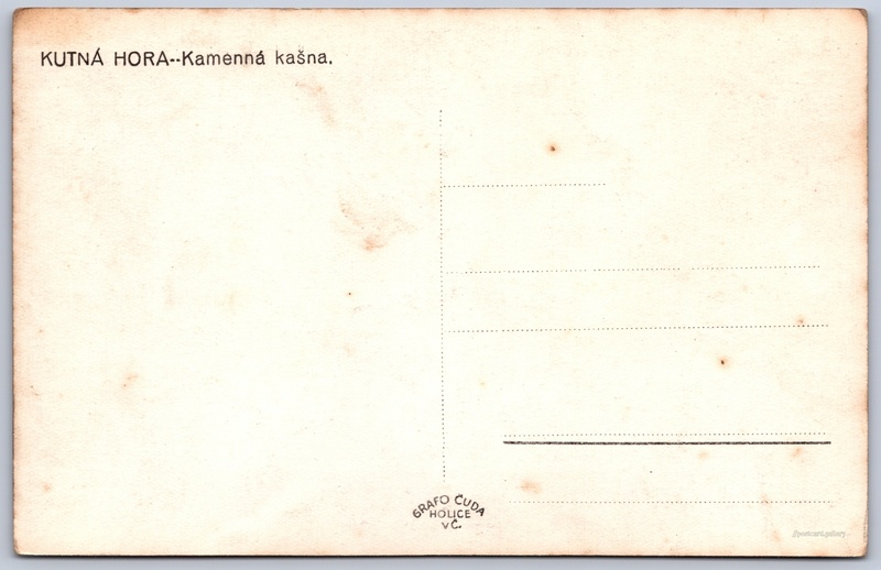 Kutná hora, kamenná kašna Pokud chcete vidět pohlednice ve vyšším rozlišení nebo zobrazovat jejich zadní stranu, tak se prosím nejdříve přihlašte Přihlásit Zaregistrovat KUTNÁ HORA - KAMENNÁ KAŠNA KUTNÁ HORA - Kamenná kašna. Jazyk tištěného textu na pohlednici: čeština Kamenná kašna Kutná Hora, Kašna, fontána, Rejskova, Kutná Hora, Česko ukázat na mapě V blízkém okolí místa zobrazeného na pohlednici lze najít 22 jiných pohlednic. Zobrazit blízké pohlednice Vydavatel: Grafo Čuda Holice (Československo) Datum vydání není známo Pomozte nám odhadnout datum vzniku pohlednice Velikost (š x v) a tvar pohlednice: 141 x 90 mm (5.55" x 3.54"), obdélník Čistá pohlednice (neprošlá poštou) DiskuseVložit příspěvek Přidat novou složku ... Spravovat složky ...