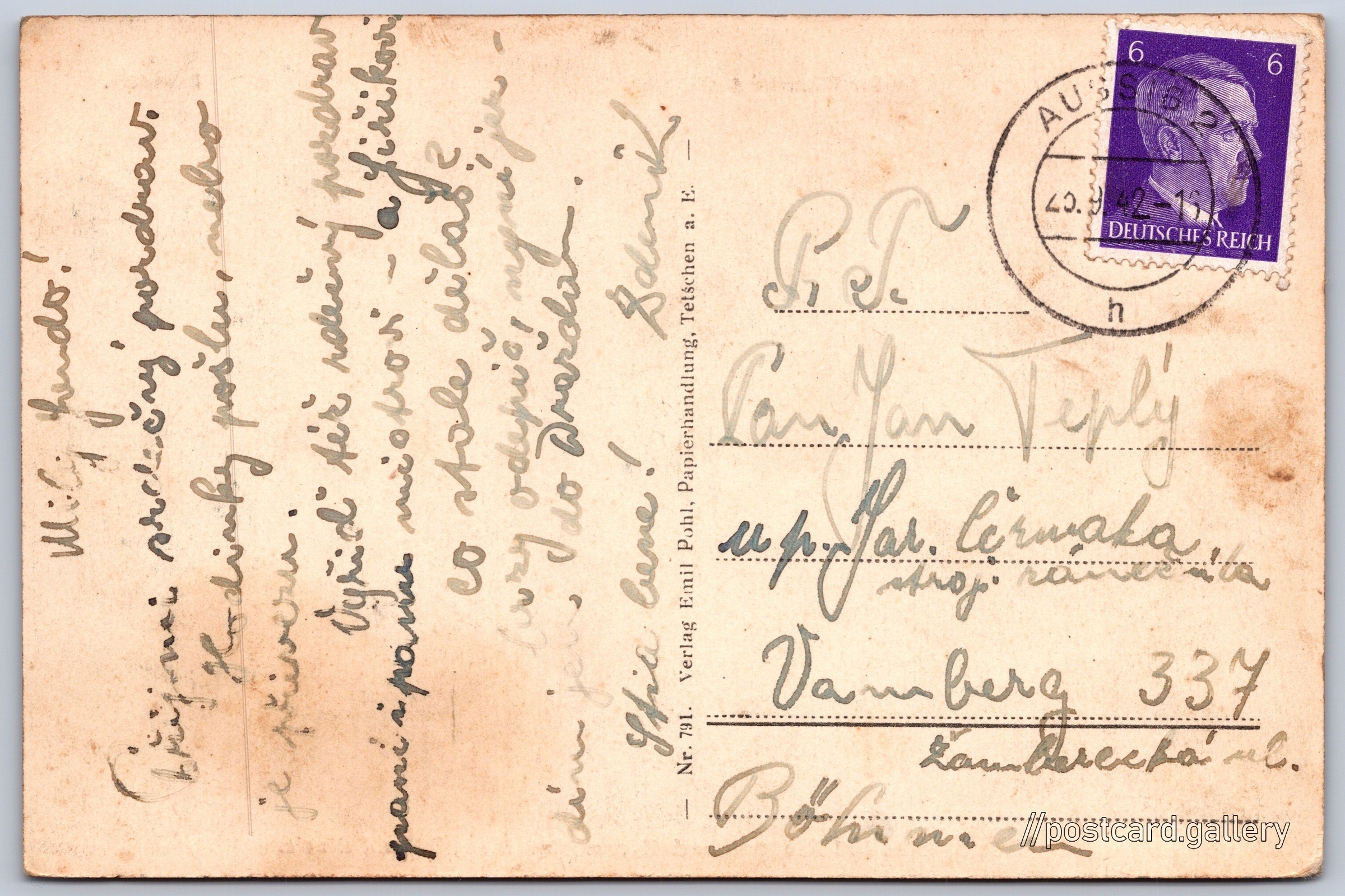 Labe u Hřenska 10/31 Pokud chcete vidět pohlednice ve vyšším rozlišení nebo zobrazovat jejich zadní stranu, tak se prosím nejdříve přihlašte Přihlásit Zaregistrovat Großer Winterberg.Das Elbetal bei Niedergrund-Herrnskretschen, Böhm. Schweiz.Belvedere. Jazyk tištěného textu na pohlednici: němčina Děčín XIV-Dolní Žleb, Děčín, Děčín ukázat na mapě V blízkém okolí místa zobrazeného na pohlednici lze najít 11 jiných pohlednic. Zobrazit blízké pohlednice Odhadované datum vydání pohlednice: 1939 - 1942 Pomozte nám zpřesnit rok vzniku pohlednice Velikost (š x v) a tvar pohlednice: 137 x 90 mm (5.39" x 3.54"), obdélník Prošlá poštou:Datum na razítku: 23.9.1942 Ceny: Vyplacené známky: 0,06 ℛℳ (RM) Kódy na pohlednici: 791 DiskuseVložit příspěvek Přidat novou složku ... Spravovat složky ...