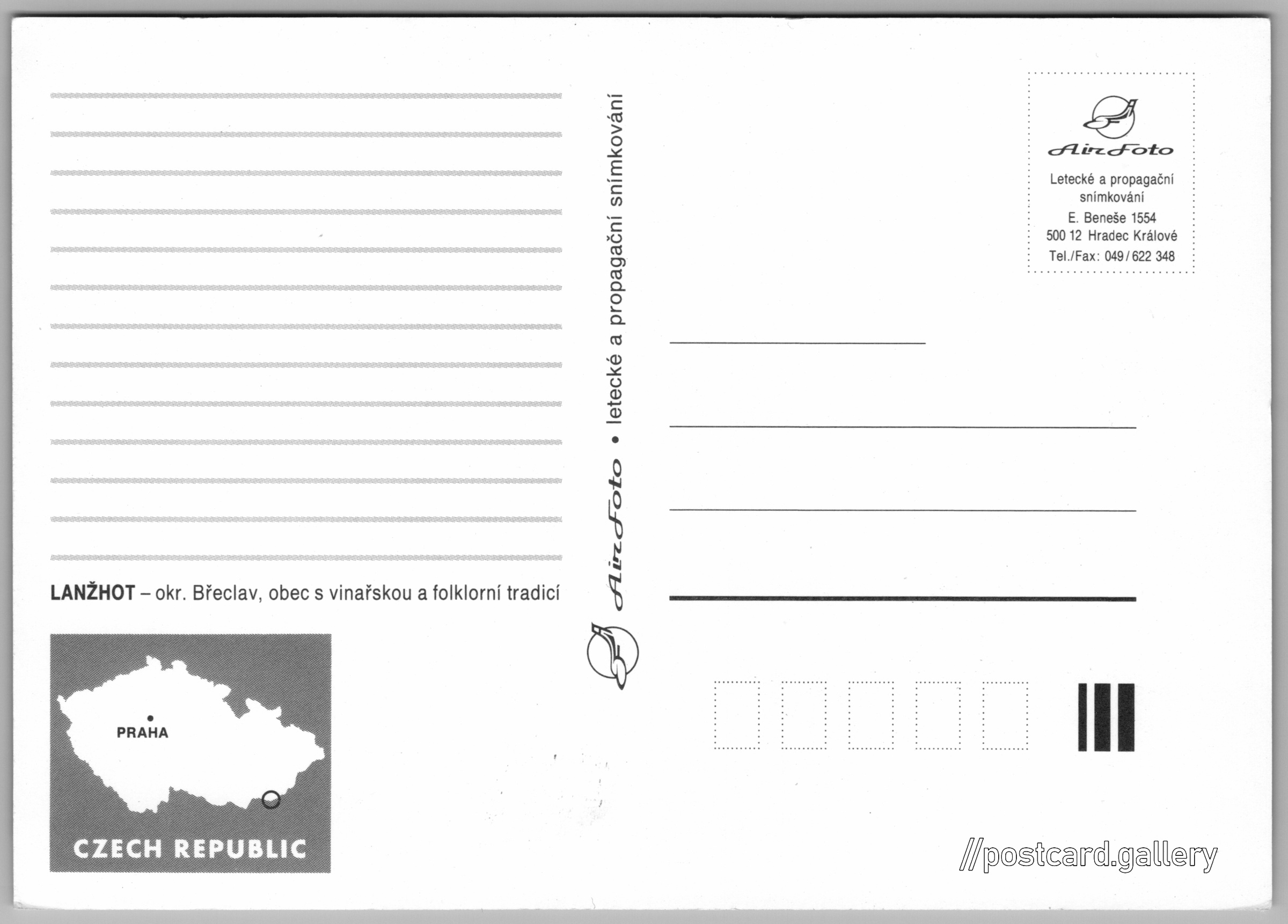 Lanžhot, letecký pohled 2/3 Pokud chcete vidět pohlednice ve vyšším rozlišení nebo zobrazovat jejich zadní stranu, tak se prosím nejdříve přihlašte Přihlásit Zaregistrovat Lanžhot LANŽHOT - okr. Břeclav, obec s vinařskou a folklorní tradicí Jazyk tištěného textu na pohlednici: čeština Lanžhot, Město, Česko ukázat na mapě V blízkém okolí místa zobrazeného na pohlednici lze najít 3 jiné pohlednice. Zobrazit blízké pohlednice Vydavatel: ArtFoto Praha (Česko) Datum vydání není známo Pomozte nám odhadnout datum vzniku pohlednice Velikost (š x v) a tvar pohlednice: 148 x 105 mm (5.83" x 4.13"), obdélník Čistá pohlednice (neprošlá poštou) DiskuseVložit příspěvek Přidat novou složku ... Spravovat složky ...