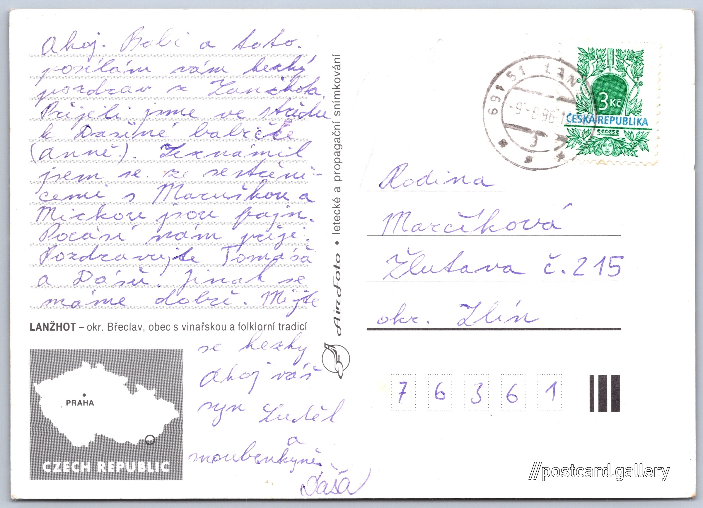 Lanžhot, letecký pohled Pokud chcete vidět pohlednice ve vyšším rozlišení nebo zobrazovat jejich zadní stranu, tak se prosím nejdříve přihlašte Přihlásit Zaregistrovat Lanžhot LANŽHOT - okr. Břeclav, obec s vinařskou a folklorní tradicí Jazyk tištěného textu na pohlednici: čeština Lanžhot, Město, Česko ukázat na mapě V blízkém okolí místa zobrazeného na pohlednici lze najít 3 jiné pohlednice. Zobrazit blízké pohlednice Vydavatel: Malý nakladatel (Česko) Odhadované datum vydání pohlednice: 1993 - 1996 Pomozte nám zpřesnit rok vzniku pohlednice Velikost (š x v) a tvar pohlednice: 148 x 105 mm (5.83" x 4.13"), obdélník Prošlá poštou:Datum na razítku: 9.8.1996 Ceny: Vyplacené známky: 3,00 Kč (CZK) DiskuseVložit příspěvek Přidat novou složku ... Spravovat složky ...
