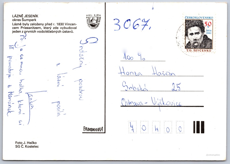 Lázně Jeseník Pokud chcete vidět pohlednice ve vyšším rozlišení nebo zobrazovat jejich zadní stranu, tak se prosím nejdříve přihlašte Přihlásit Zaregistrovat Lázně Jeseník LÁZNĚ JESENÍKokres ŠumperkLázně byly založeny před r. 1830 Vincencem Priessnitzem, který zde vybudoval jeden z prvních vodoléčebných ústavů. Jazyk tištěného textu na pohlednici: čeština Jeseník, Jeseník ukázat na mapě Vydavatel: Panorama (Československo) Odhadované datum vydání pohlednice: 1987 - 1989 Pomozte nám zpřesnit rok vzniku pohlednice Velikost (š x v) a tvar pohlednice: 148 x 105 mm (5.83" x 4.13"), obdélník Osoby spjaté s touto pohlednicí: J. Hečko(Autor fotografie) Vincenc Priessnitz(Obsah pohlednice) Prošlá poštou Ceny: Příplatek na tur. ruch: 0,20 Kčs (CSK))Vyplacené známky: 0,50 Kčs (CSK) DiskuseVložit příspěvek Přidat novou složku ... Spravovat složky ...
