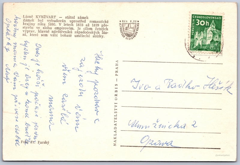 Lázně Kynžvart, státní zámek Pokud chcete vidět pohlednice ve vyšším rozlišení nebo zobrazovat jejich zadní stranu, tak se prosím nejdříve přihlašte Přihlásit Zaregistrovat Lázně KYNŽVART - státní zámekZámek byl vybudován uprostřed romantické krajiny roku 1690. V letech 1833 až 1839 přestavěn ve slohu empirovém. Je cílem četných výprav, hlavně návštěvníků západočeských lázní, které sem vábí bohaté umělecké sbírky. Jazyk tištěného textu na pohlednici: čeština Zámek Kynžvart, Zámek, Zámek 347, Lázně Kynžvart, Česko ukázat na mapě V blízkém okolí místa zobrazeného na pohlednici lze najít 4 jiné pohlednice. Zobrazit blízké pohlednice Vydavatel: Nakladatelství Orbis (Československo) Odhadované datum vydání pohlednice: 1960 - 1965 Pomozte nám zpřesnit rok vzniku pohlednice Velikost (š x v) a tvar pohlednice: 148 x 100 mm (5.83" x 3.94"), obdélník Osoby spjaté s touto pohlednicí: Fr. Farský(Autor fotografie) Prošlá poštou Ceny: Příplatek na tur. ruch: 0,20 Kčs (CSK))Vyplacené známky: 0,30 Kčs (CSK) DiskuseVložit příspěvek Přidat novou složku ... Spravovat složky ...