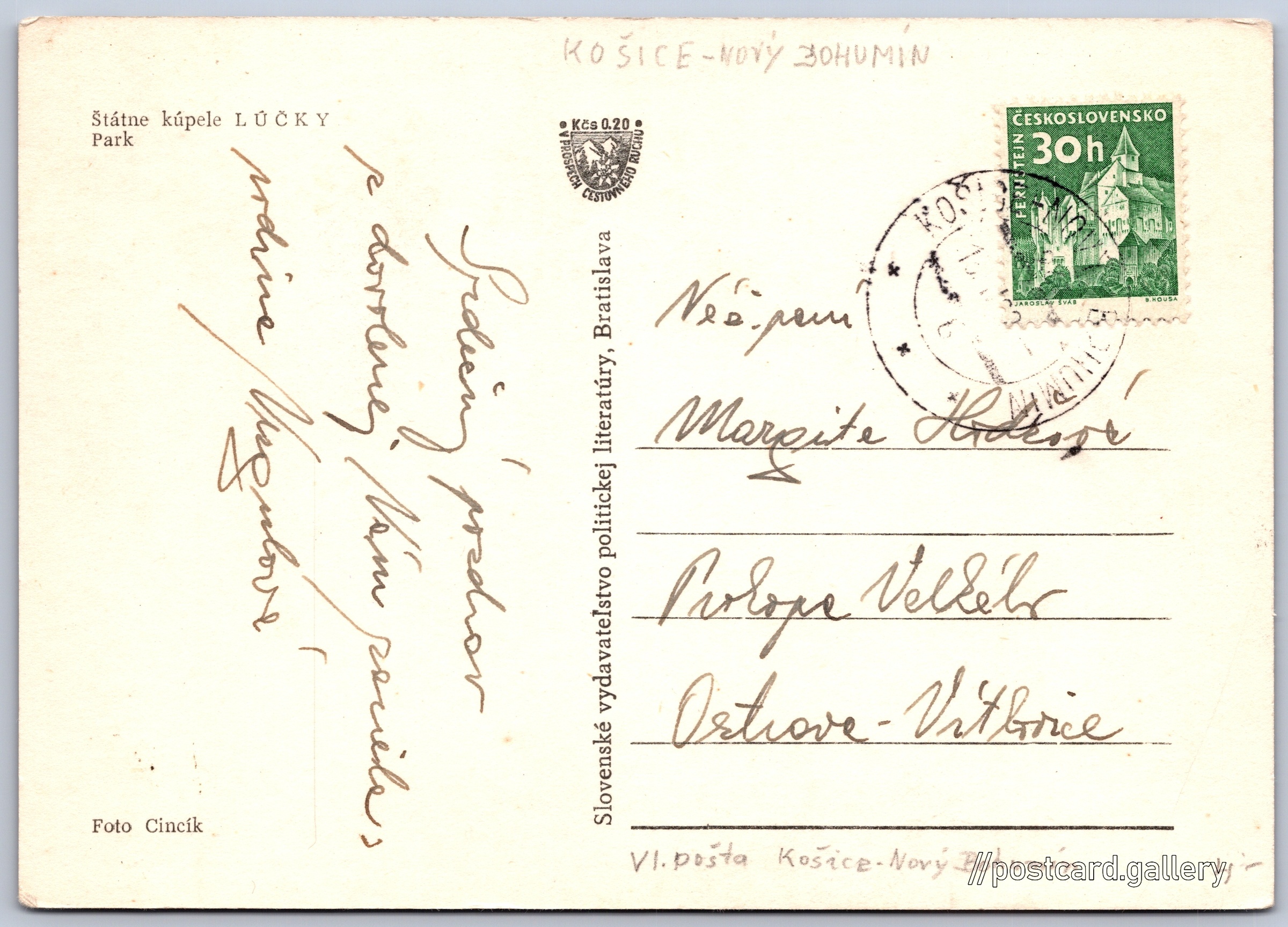 Lázně Lúčky, park Pokud chcete vidět pohlednice ve vyšším rozlišení nebo zobrazovat jejich zadní stranu, tak se prosím nejdříve přihlašte Přihlásit Zaregistrovat Štátne kúpele LÚČKYPark Jazyk tištěného textu na pohlednici: slovenština 2216 ukázat na mapě Přesné místo není známo. Pokud jej znáte, tak jej prosím napište do komentářů nebo označte na mapě Vydavatel: VPL (Československo) Odhadované datum vydání pohlednice: 1960 - 1963 Pomozte nám zpřesnit rok vzniku pohlednice Velikost (š x v) a tvar pohlednice: 146 x 103 mm (5.75" x 4.06"), obdélník Osoby spjaté s touto pohlednicí: Jozef Cincík(Autor fotografie) Prošlá poštou Ceny: Příplatek na tur. ruch: 0,20 Kčs (CSK))Vyplacené známky: 0,30 Kčs (CSK) DiskuseVložit příspěvek Přidat novou složku ... Spravovat složky ...