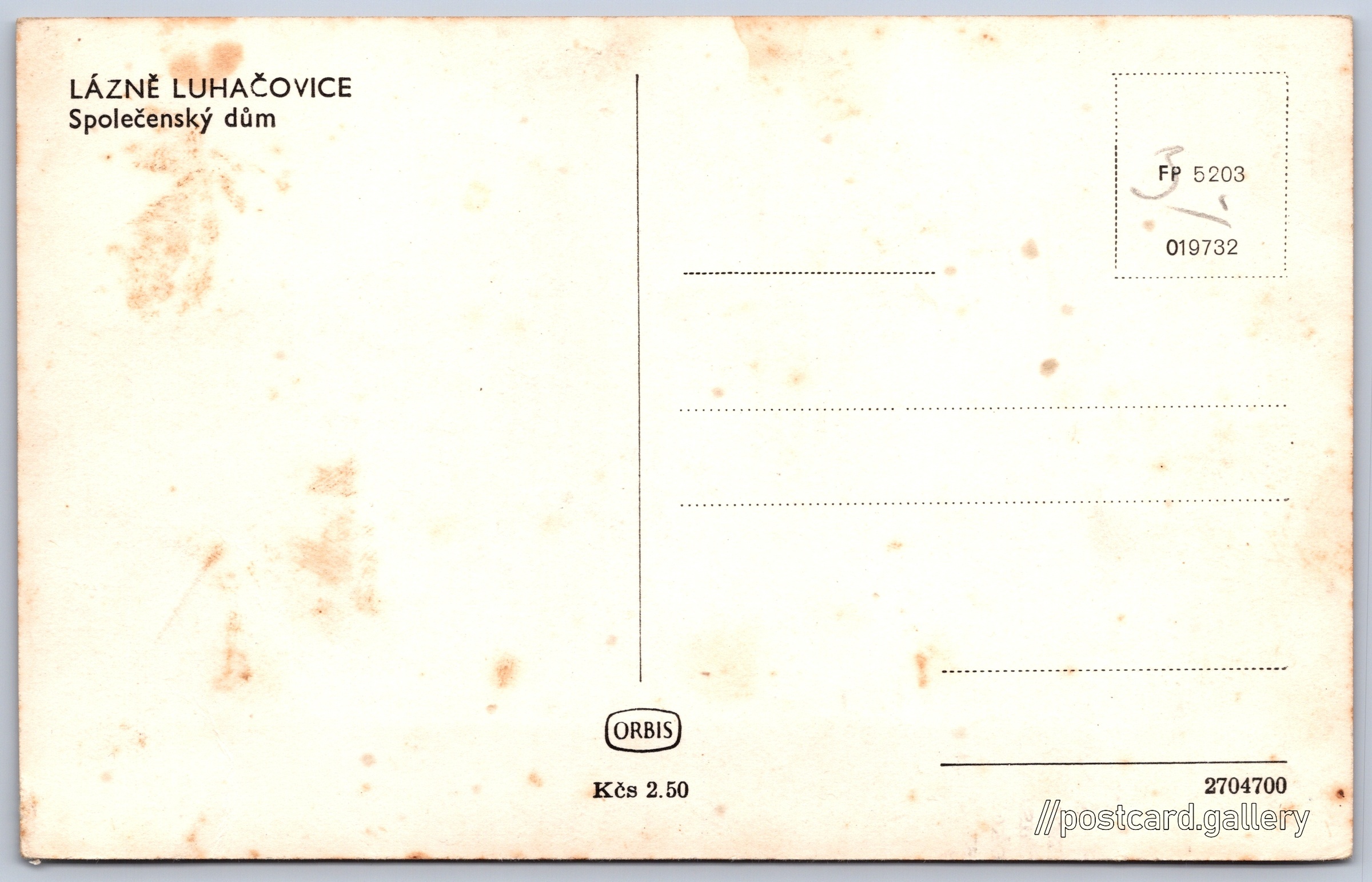 Lázně Luhačovice, Společenský dům Pokud chcete vidět pohlednice ve vyšším rozlišení nebo zobrazovat jejich zadní stranu, tak se prosím nejdříve přihlašte Přihlásit Zaregistrovat LÁZNĚ LUHAČOVICESpolečenský dům Jazyk tištěného textu na pohlednici: čeština Hotel Společenský dům, Lázeňské náměstí 127, Luhačovice, Česko ukázat na mapě V blízkém okolí místa zobrazeného na pohlednici lze najít 29 jiných pohlednic. Zobrazit blízké pohlednice Vydavatel: Nakladatelství Orbis (Československo) Datum vydání není známo Pomozte nám odhadnout datum vzniku pohlednice Velikost (š x v) a tvar pohlednice: 138 x 88 mm (5.43" x 3.46"), obdélník Čistá pohlednice (neprošlá poštou) Ceny: Cena pohlednice: 2,50 Kčs (CSK) Kódy na pohlednici: FP 5203 019732 2704700 DiskuseVložit příspěvek Přidat novou složku ... Spravovat složky ...