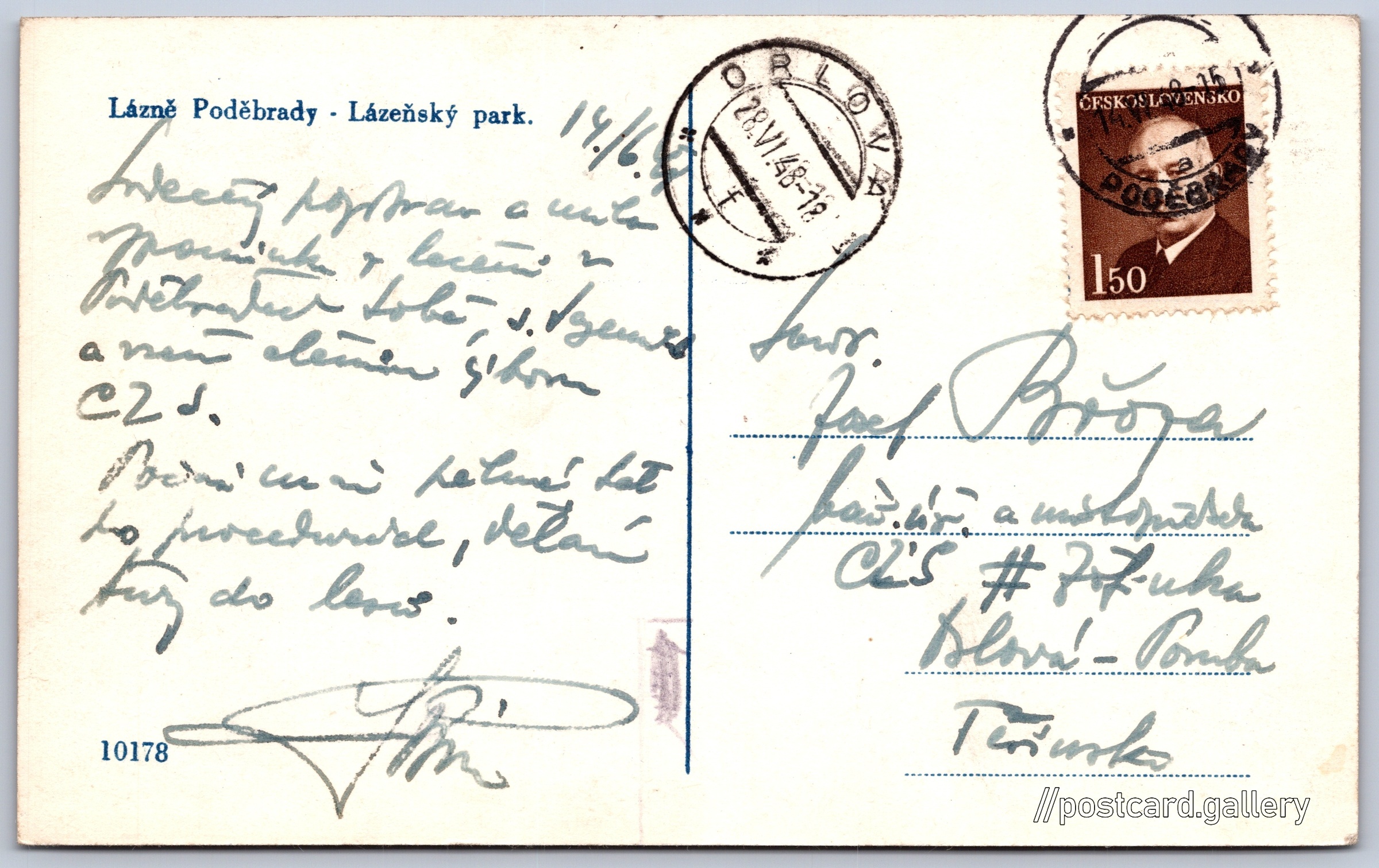 Lázně Poděbrady, lázeňský park 6/14 Pokud chcete vidět pohlednice ve vyšším rozlišení nebo zobrazovat jejich zadní stranu, tak se prosím nejdříve přihlašte Přihlásit Zaregistrovat Lázně Poděbrady - Lázeňský park. Jazyk tištěného textu na pohlednici: čeština Poděbrady II, Poděbrady, Nymburk ukázat na mapě V blízkém okolí místa zobrazeného na pohlednici lze najít 14 jiných pohlednic. Zobrazit blízké pohlednice Odhadované datum vydání pohlednice: 1945 - 1948 Pomozte nám zpřesnit rok vzniku pohlednice Velikost (š x v) a tvar pohlednice: 138 x 86 mm (5.43" x 3.39"), obdélník Prošlá poštou:Datum na razítku: 28.6.1948Datum napsání pohledu: 14.6.1948 Ceny: Vyplacené známky: 1,50 Kčs (CSK) Kódy na pohlednici: 10178 DiskuseVložit příspěvek Přidat novou složku ... Spravovat složky ...
