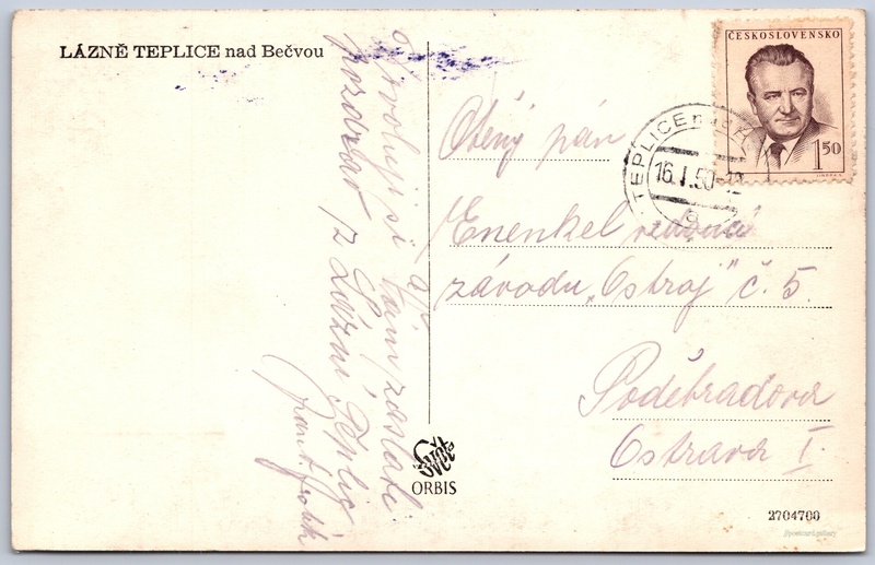 Lázně Teplice nad Bečvou Pokud chcete vidět pohlednice ve vyšším rozlišení nebo zobrazovat jejich zadní stranu, tak se prosím nejdříve přihlašte Přihlásit Zaregistrovat LÁZNĚ TEPLICE nad Bečvou Jazyk tištěného textu na pohlednici: čeština Teplice nad Bečvou, Přerov ukázat na mapě V blízkém okolí místa zobrazeného na pohlednici lze najít 14 jiných pohlednic. Zobrazit blízké pohlednice Vydavatel: Nakladatelství Orbis (Československo) Odhadované datum vydání pohlednice: 1947 - 1950 Pomozte nám zpřesnit rok vzniku pohlednice Velikost (š x v) a tvar pohlednice: 139 x 89 mm (5.47" x 3.50"), obdélník Prošlá poštou:Datum na razítku: 16.1.1950 Ceny: Vyplacené známky: 1,50 Kčs (CSK) Kódy na pohlednici: 2704700 DiskuseVložit příspěvek Přidat novou složku ... Spravovat složky ...
