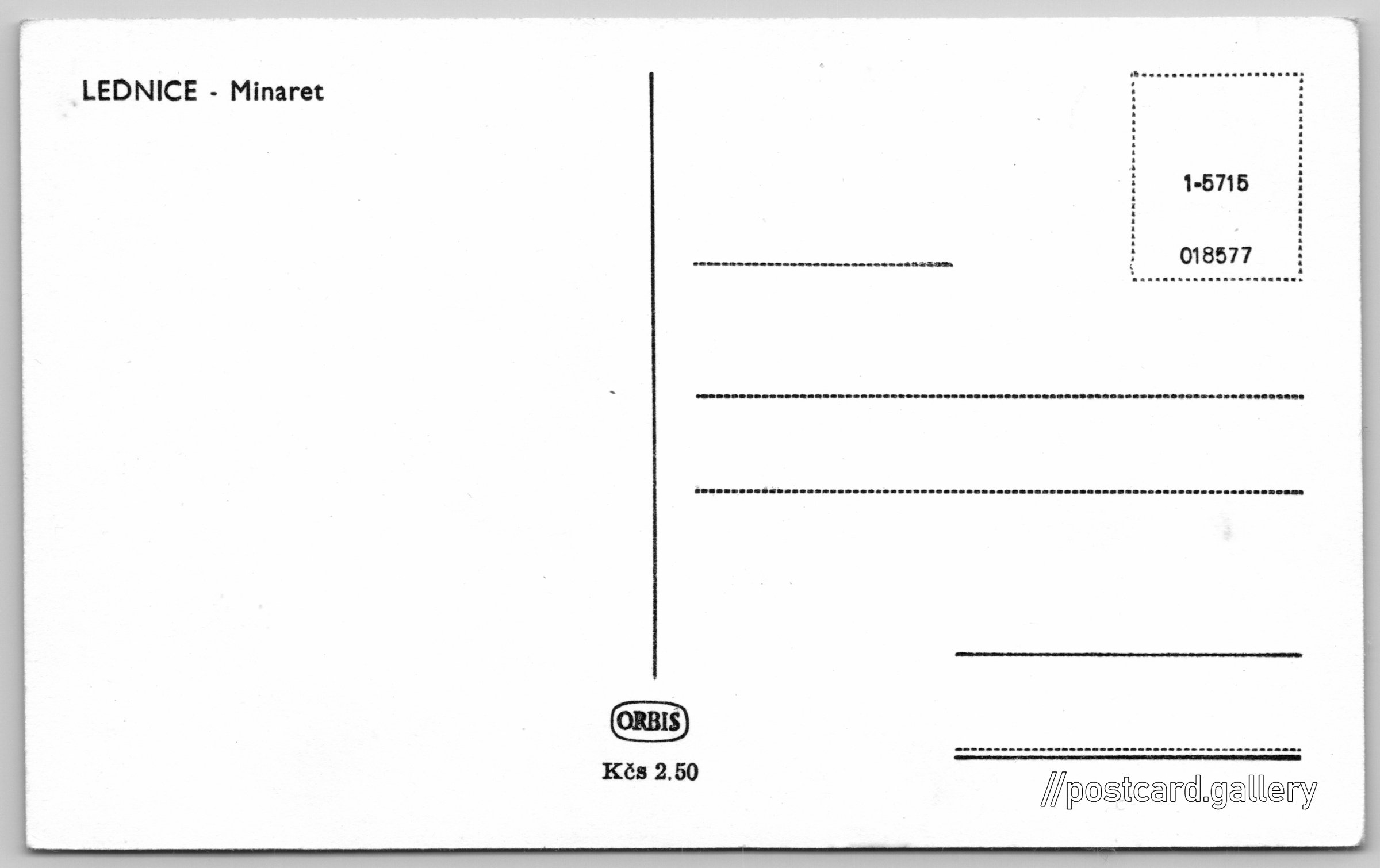 Lednice, minaret Pokud chcete vidět pohlednice ve vyšším rozlišení nebo zobrazovat jejich zadní stranu, tak se prosím nejdříve přihlašte Přihlásit Zaregistrovat LEDNICE - Minaret Jazyk tištěného textu na pohlednici: čeština Minaret Lednice, Rozhledna, Park 434, Lednice, Česko ukázat na mapě V blízkém okolí místa zobrazeného na pohlednici lze najít 18 jiných pohlednic. Zobrazit blízké pohlednice Vydavatel: Nakladatelství Orbis (Československo) Datum vydání není známo Pomozte nám odhadnout datum vzniku pohlednice Velikost (š x v) a tvar pohlednice: 138 x 86 mm (5.43" x 3.39"), obdélník Čistá pohlednice (neprošlá poštou) Ceny: Cena pohlednice: 2,50 Kčs (CSK) Kódy na pohlednici: 1-5715 018577 DiskuseVložit příspěvek Přidat novou složku ... Spravovat složky ...