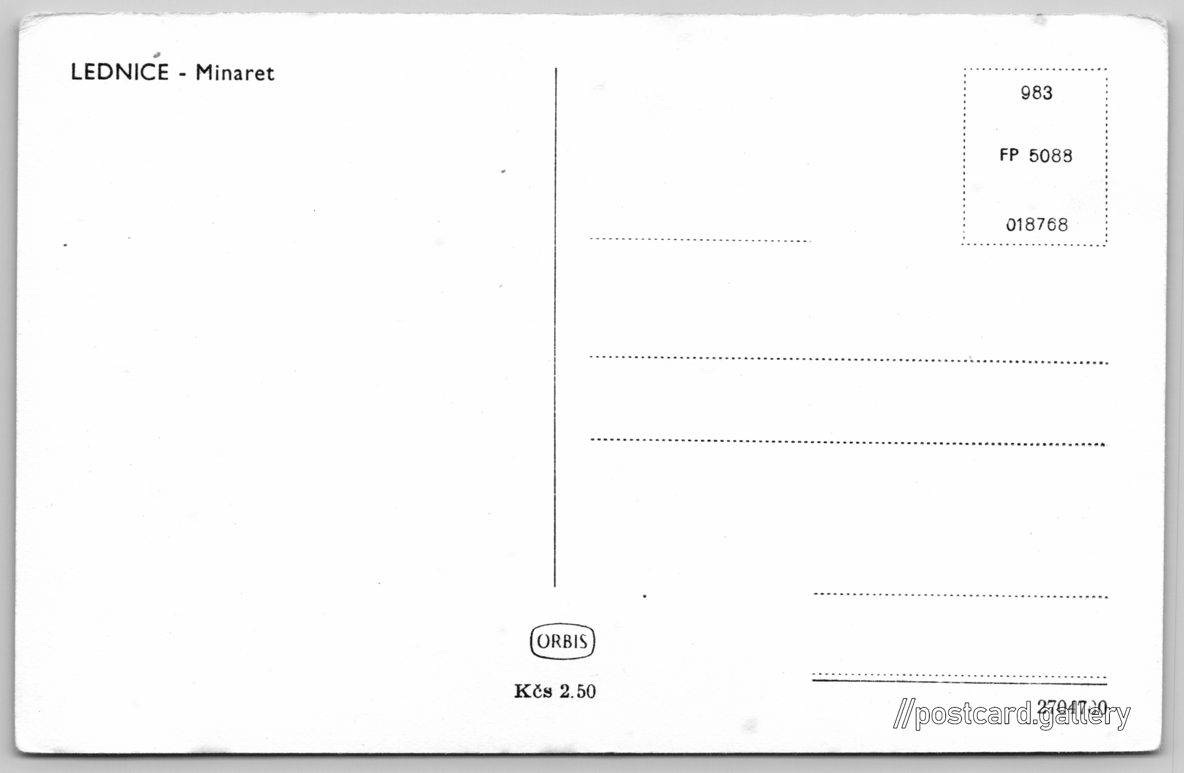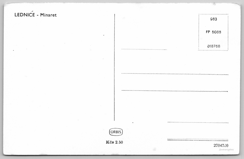 Lednice, minaret Pokud chcete vidět pohlednice ve vyšším rozlišení nebo zobrazovat jejich zadní stranu, tak se prosím nejdříve přihlašte Přihlásit Zaregistrovat LEDNICE - Minaret Jazyk tištěného textu na pohlednici: čeština Minaret Lednice, Rozhledna, Park 434, Lednice, Česko ukázat na mapě V blízkém okolí místa zobrazeného na pohlednici lze najít 18 jiných pohlednic. Zobrazit blízké pohlednice Vydavatel: Nakladatelství Orbis (Československo) Datum vydání není známo Pomozte nám odhadnout datum vzniku pohlednice Velikost (š x v) a tvar pohlednice: 140 x 90 mm (5.51" x 3.54"), obdélník Čistá pohlednice (neprošlá poštou) Ceny: Cena pohlednice: 2,50 Kčs (CSK) Kódy na pohlednici: 983 FP 5088 018768 2704700 DiskuseVložit příspěvek Přidat novou složku ... Spravovat složky ...