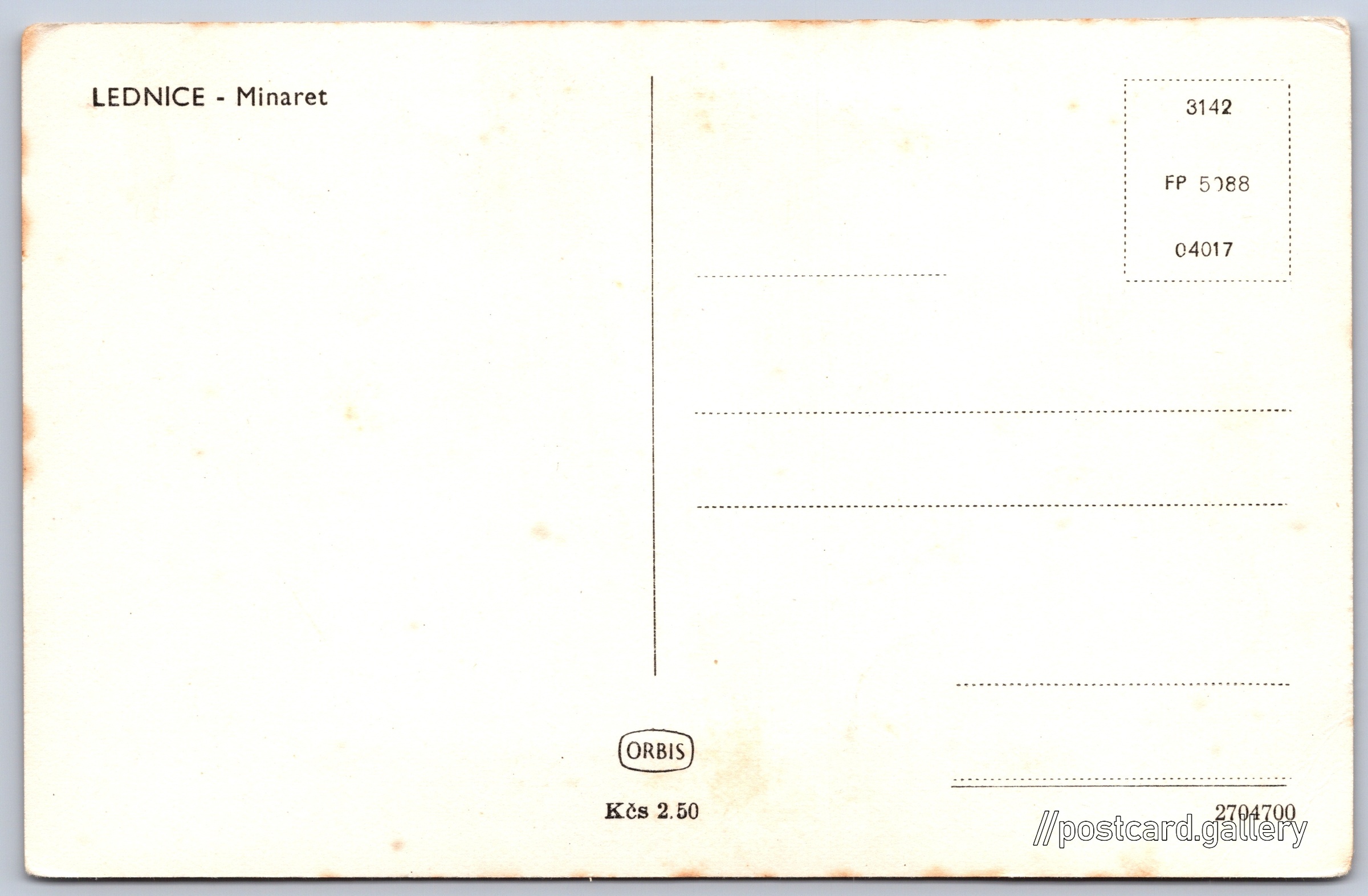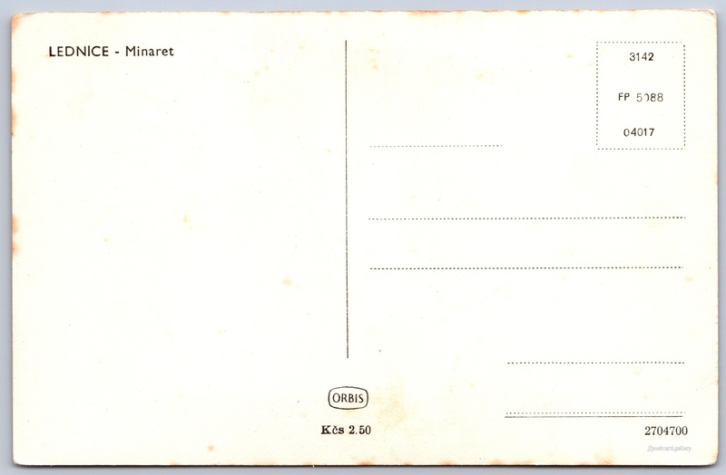 Lednice, minaret 2/18 Pokud chcete vidět pohlednice ve vyšším rozlišení nebo zobrazovat jejich zadní stranu, tak se prosím nejdříve přihlašte Přihlásit Zaregistrovat LEDNICE - Minaret Jazyk tištěného textu na pohlednici: čeština Minaret Lednice, Rozhledna, Park 434, Lednice, Česko ukázat na mapě V blízkém okolí místa zobrazeného na pohlednici lze najít 18 jiných pohlednic. Zobrazit blízké pohlednice Vydavatel: Nakladatelství Orbis (Československo) Datum vydání není známo Pomozte nám odhadnout datum vzniku pohlednice Velikost (š x v) a tvar pohlednice: 139 x 91 mm (5.47" x 3.58"), obdélník Čistá pohlednice (neprošlá poštou) Ceny: Cena pohlednice: 2,50 Kčs (CSK) Kódy na pohlednici: 3142 FP 5088 04017 2704700 DiskuseVložit příspěvek Přidat novou složku ... Spravovat složky ...