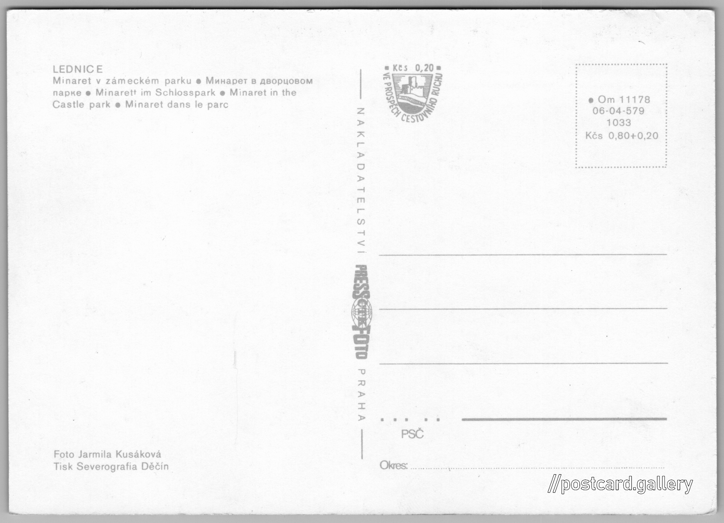 Lednice, minaret Pokud chcete vidět pohlednice ve vyšším rozlišení nebo zobrazovat jejich zadní stranu, tak se prosím nejdříve přihlašte Přihlásit Zaregistrovat LEDNICE- Minaret v zámeckém parku- Минарет в дворцовом парке- Minarett im Schlosspark- Minaret in the Castle park- Minaret dans le parc Jazyk tištěného textu na pohlednici: čeština Minaret Lednice, Rozhledna, Park 434, Lednice, Česko ukázat na mapě V blízkém okolí místa zobrazeného na pohlednici lze najít 18 jiných pohlednic. Zobrazit blízké pohlednice Vydavatel: PressFoto Praha (Československo) Rok vydání pohlednice: 1975 Velikost (š x v) a tvar pohlednice: 148 x 105 mm (5.83" x 4.13"), obdélník Osoby spjaté s touto pohlednicí: Jarmila Kusáková(Autor fotografie) Čistá pohlednice (neprošlá poštou) Ceny: Cena pohlednice: 0,80 Kčs (CSK) (+0,20 Kčs přípl. na tur. ruch) Kódy na pohlednici: Om 11178 06-04-579 1033 DiskuseVložit příspěvek Přidat novou složku ... Spravovat složky ...