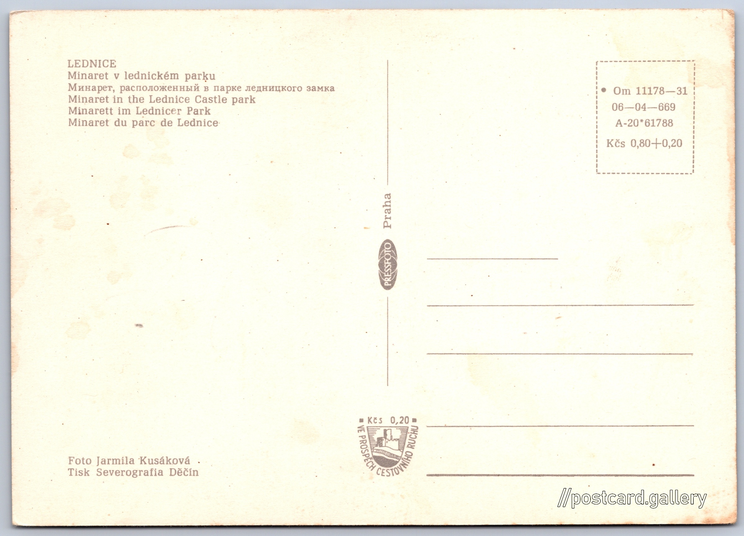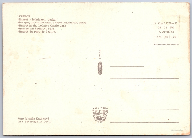 Lednice, minaret 1/18 Pokud chcete vidět pohlednice ve vyšším rozlišení nebo zobrazovat jejich zadní stranu, tak se prosím nejdříve přihlašte Přihlásit Zaregistrovat LEDNICE- Minaret v lednickém parku- Минарет, расположенный в парке ледницкого замка- Minaret in the Lednice Castle park- Minarett im Lednicer Park- Minaret du parc de Lednice Jazyk tištěného textu na pohlednici: čeština Minaret Lednice, Rozhledna, Park 434, Lednice, Česko ukázat na mapě V blízkém okolí místa zobrazeného na pohlednici lze najít 18 jiných pohlednic. Zobrazit blízké pohlednice Vydavatel: PressFoto Praha (Československo) Rok vydání pohlednice: 1966 Velikost (š x v) a tvar pohlednice: 148 x 105 mm (5.83" x 4.13"), obdélník Osoby spjaté s touto pohlednicí: Jarmila Kusáková(Autor fotografie) Čistá pohlednice (neprošlá poštou) Ceny: Cena pohlednice: 0,80 Kčs (CSK) (+0,20 Kčs přípl. na tur. ruch) Kódy na pohlednici: •Om 11178-31 06-04-669 A-20*61788 DiskuseVložit příspěvek Přidat novou složku ... Spravovat složky ...