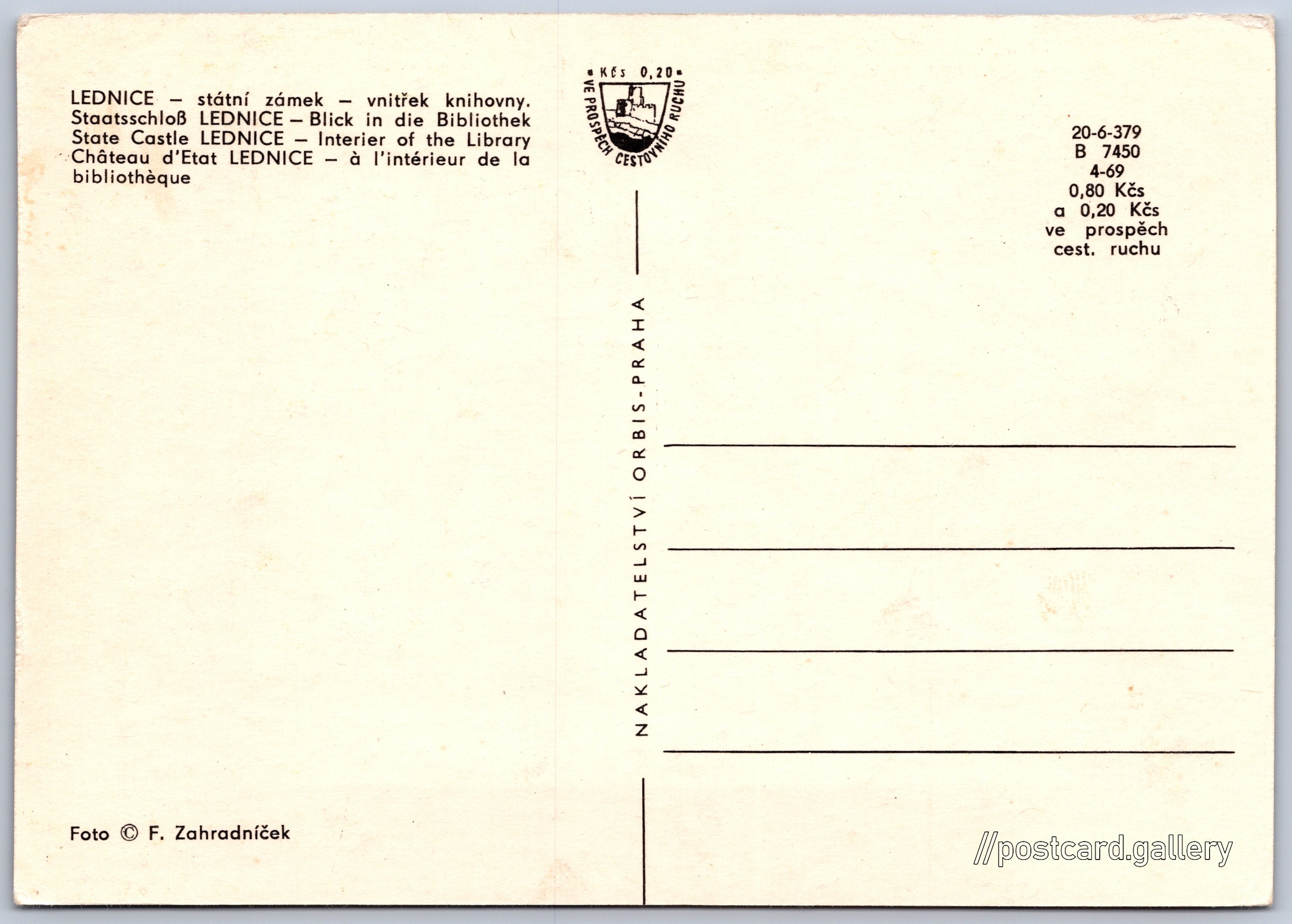 Cena pohlednice: 0,80 Kčs (CSK) (+0,20 Kčs přípl. na tur. ruch)