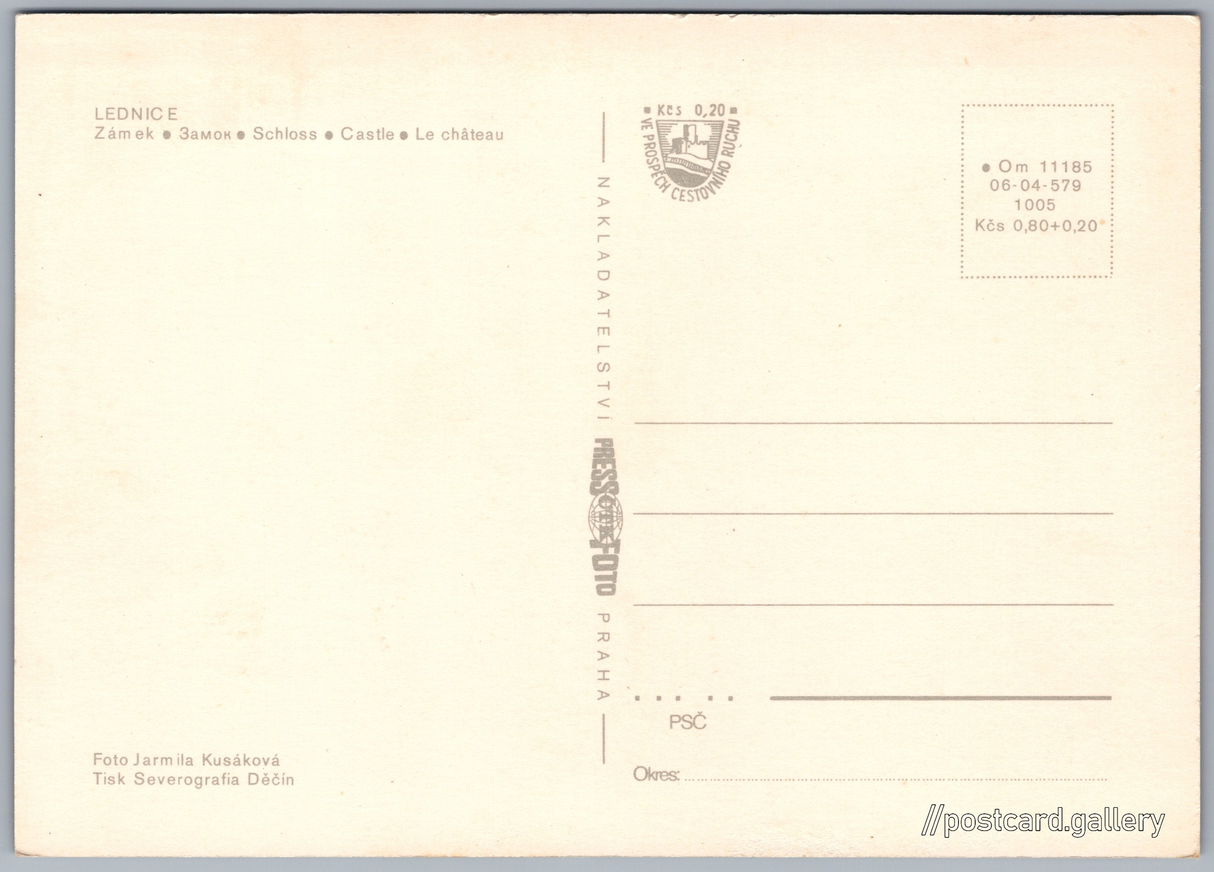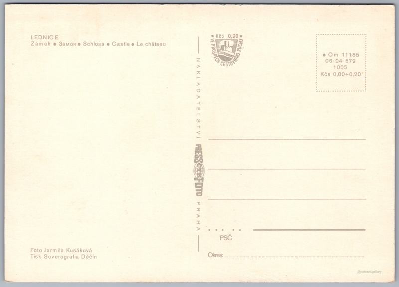 Lednický zámek Pokud chcete vidět pohlednice ve vyšším rozlišení nebo zobrazovat jejich zadní stranu, tak se prosím nejdříve přihlašte Přihlásit Zaregistrovat LEDNICE- Zámek- 3амок- Schloss- Castle- Le château Jazyk tištěného textu na pohlednici: čeština Lednice, Břeclav ukázat na mapě V blízkém okolí místa zobrazeného na pohlednici lze najít 18 jiných pohlednic. Zobrazit blízké pohlednice Vydavatel: PressFoto Praha (Československo) Rok vydání pohlednice: 1975 Velikost (š x v) a tvar pohlednice: 148 x 106 mm (5.83" x 4.17"), obdélník Osoby spjaté s touto pohlednicí: Jarmila Kusáková(Autor fotografie) Čistá pohlednice (neprošlá poštou) Ceny: Cena pohlednice: 0,80 Kčs (CSK) (+0,20 Kčs přípl. na tur. ruch) Kódy na pohlednici: Om 11185 06-04-579 1005 DiskuseVložit příspěvek Přidat novou složku ... Spravovat složky ...