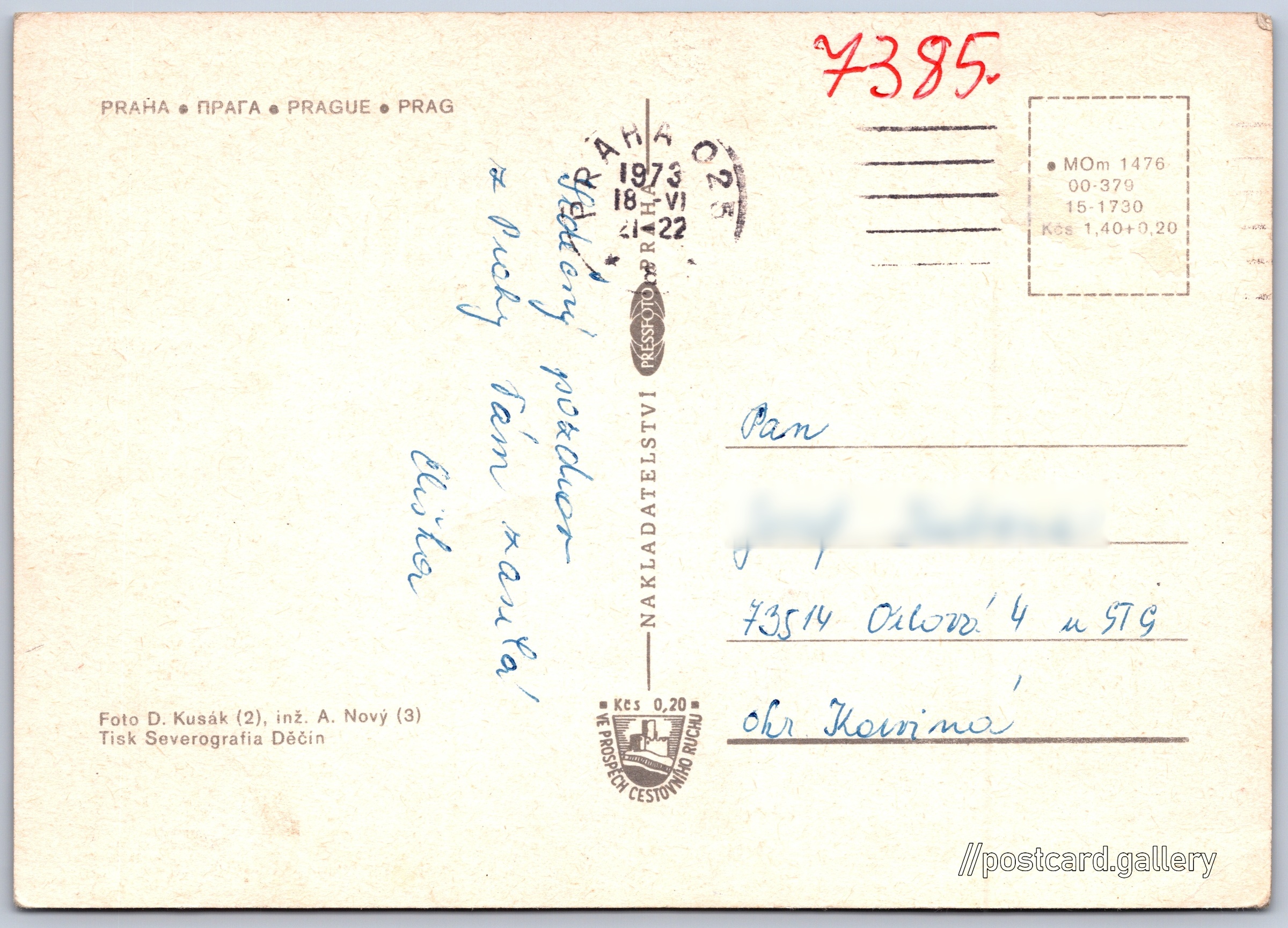 Letiště Praha 8/17 Pokud chcete vidět pohlednice ve vyšším rozlišení nebo zobrazovat jejich zadní stranu, tak se prosím nejdříve přihlašte Přihlásit Zaregistrovat LetištěPraha PRAHA - ПPATA - PRAGUE - PRAG Jazyky tištěného textu na pohlednici: ruština, angličtina, němčina Praha 6, Praha, Hlavní město Praha ukázat na mapě Vydavatel: PressFoto Praha (Československo) Rok vydání pohlednice: 1973 Velikost (š x v) a tvar pohlednice: 148 x 105 mm (5.83" x 4.13"), obdélník Osoby spjaté s touto pohlednicí: Dalibor Kusák(Autor fotografie) Antonín E. Nový(Autor fotografie) Prošlá poštou:Datum na razítku: 18.6.1973 Ceny: Cena pohlednice: 1,40 Kčs (CSK) (+0,20 Kčs přípl. na tur. ruch) Kódy na pohlednici: •MOm 1476 00-379 15-1730 DiskuseVložit příspěvek Přidat novou složku ... Spravovat složky ...