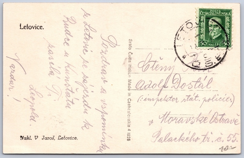 Letovice, zámek Pokud chcete vidět pohlednice ve vyšším rozlišení nebo zobrazovat jejich zadní stranu, tak se prosím nejdříve přihlašte Přihlásit Zaregistrovat Letovice. Jazyk tištěného textu na pohlednici: čeština Zámek Letovice, Zámek, Zámek 1/4, Letovice, Česko ukázat na mapě V blízkém okolí místa zobrazeného na pohlednici lze najít 2 jiné pohlednice. Zobrazit blízké pohlednice Vydavatel: V. Jaroš, Letovice (Česko) Rok vydání pohlednice: duben, 1928 Velikost (š x v) a tvar pohlednice: 137 x 87 mm (5.39" x 3.43"), obdélník Prošlá poštou Ceny: Vyplacené známky: 0,50 Kčs (CSK) DiskuseVložit příspěvek Přidat novou složku ... Spravovat složky ...
