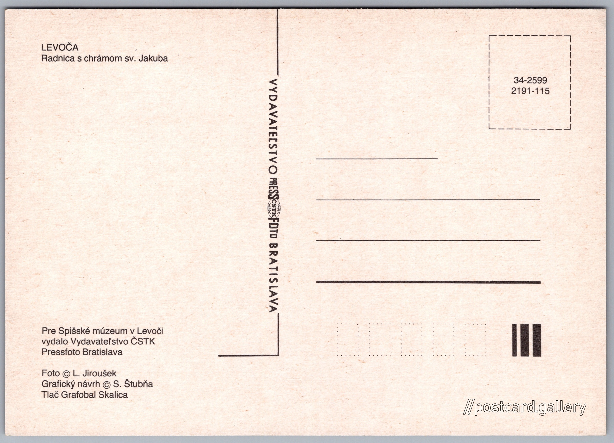 Levoča, náměstí 3/3 Pokud chcete vidět pohlednice ve vyšším rozlišení nebo zobrazovat jejich zadní stranu, tak se prosím nejdříve přihlašte Přihlásit Zaregistrovat Levoča LEVOČARadnica s chrámom sv. Jakuba Jazyk tištěného textu na pohlednici: slovenština Mestský úrad Levoča, Námestie Majstra Pavla 4/4, Levoča, Slovensko ukázat na mapě V blízkém okolí místa zobrazeného na pohlednici lze najít 3 jiné pohlednice. Zobrazit blízké pohlednice Vydavatel: PressFoto Bratislava (Československo) Rok vydání pohlednice: 1991 Velikost (š x v) a tvar pohlednice: 148 x 105 mm (5.83" x 4.13"), obdélník Osoby spjaté s touto pohlednicí: S. Štubňa(Design pohlednice) Ladislav Jiroušek(Autor fotografie) Čistá pohlednice (neprošlá poštou) Kódy na pohlednici: 34-2599 2191-115 DiskuseVložit příspěvek Přidat novou složku ... Spravovat složky ...