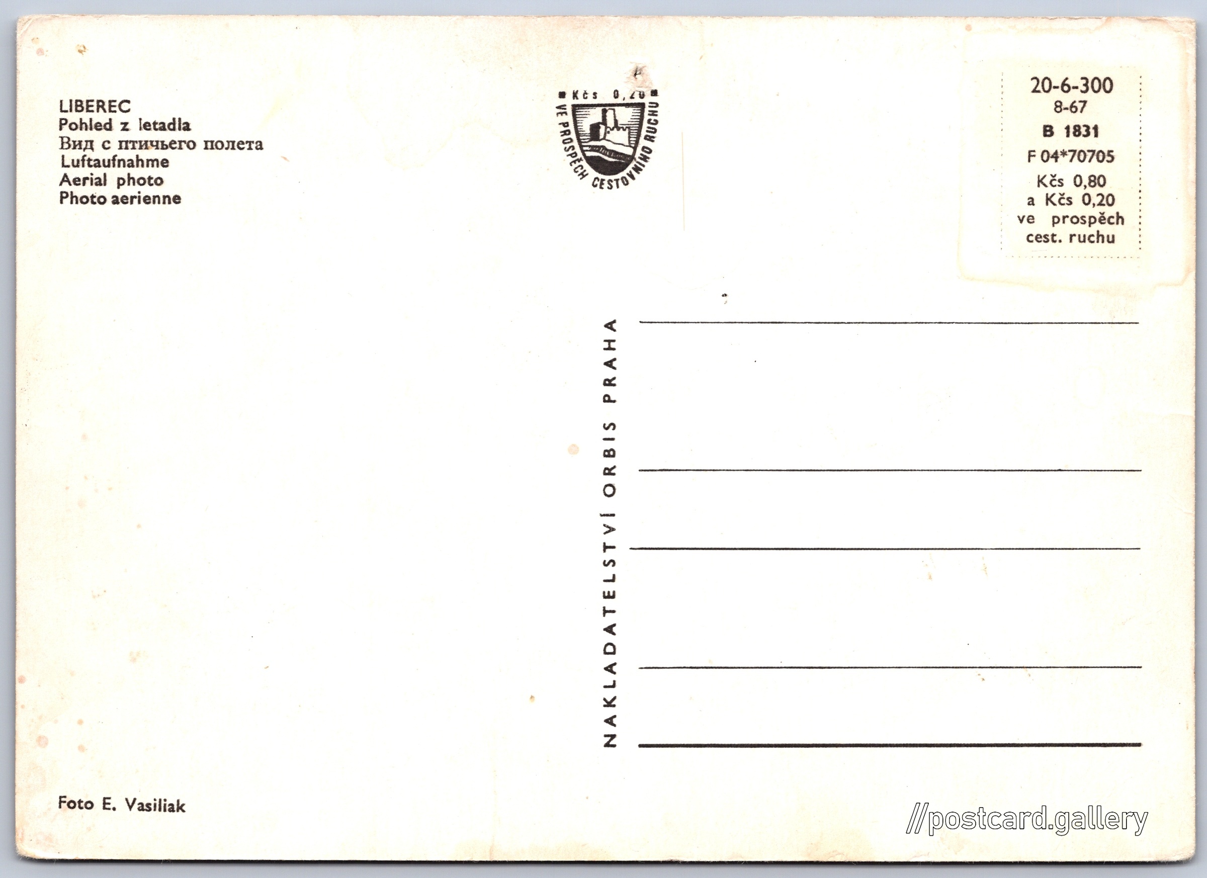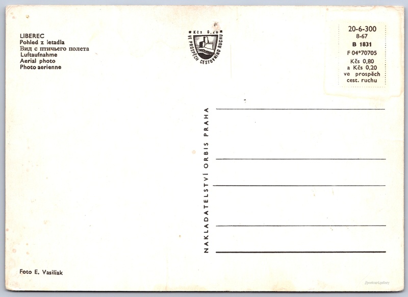 Liberec, letecký pohled na centrum města Pokud chcete vidět pohlednice ve vyšším rozlišení nebo zobrazovat jejich zadní stranu, tak se prosím nejdříve přihlašte Přihlásit Zaregistrovat LIBEREC- Pohled z letadla- Вид с птичьего полета- Luftaufnahme- Aerial photo- Photo aerienne Jazyky tištěného textu na pohlednici: čeština, ruština, němčina, angličtina, francouzština, francouzština nám. Dr. E. Beneše, Liberec, Liberec ukázat na mapě V blízkém okolí místa zobrazeného na pohlednici lze najít 5 jiných pohlednic. Zobrazit blízké pohlednice Vydavatel: Nakladatelství Orbis (Československo) Datum vydání není známo Pomozte nám odhadnout datum vzniku pohlednice Velikost (š x v) a tvar pohlednice: 147 x 105 mm (5.79" x 4.13"), obdélník Osoby spjaté s touto pohlednicí: Eugen Vasiliak(Autor fotografie) Čistá pohlednice (neprošlá poštou) Ceny: Cena pohlednice: 0,80 Kčs (CSK) (+0,20 Kčs přípl. na tur. ruch) Kódy na pohlednici: 20-6-300 8-67 B 1831 F 04*70705 DiskuseVložit příspěvek Přidat novou složku ... Spravovat složky ...