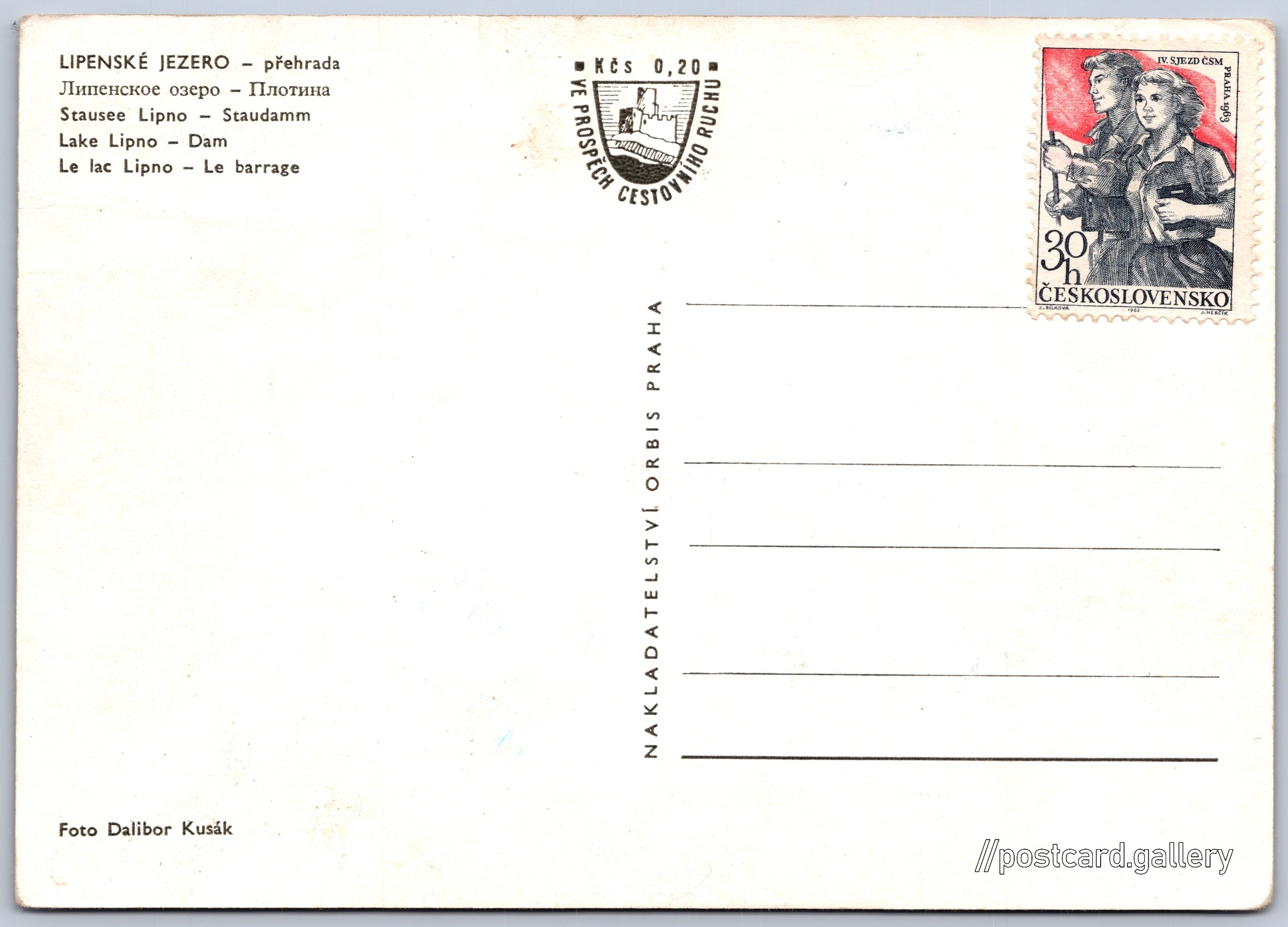 Lipenská přehrada Pokud chcete vidět pohlednice ve vyšším rozlišení nebo zobrazovat jejich zadní stranu, tak se prosím nejdříve přihlašte Přihlásit Zaregistrovat LIPENSKÉ JEZERO - přehrada- Липенское озеро - Плотина- Stausee Lipno - Staudamm- Lake Lipno - Dam- Le lac Lipno - Le barrage Jazyky tištěného textu na pohlednici: čeština, ruština, němčina, angličtina, francouzština, francouzština Lipno nad Vltavou, Český Krumlov ukázat na mapě V blízkém okolí místa zobrazeného na pohlednici lze najít 2 jiné pohlednice. Zobrazit blízké pohlednice Vydavatel: Nakladatelství Orbis (Československo) Odhadované datum vydání pohlednice: 1960 - 1963 Pomozte nám zpřesnit rok vzniku pohlednice Velikost (š x v) a tvar pohlednice: 147 x 103 mm (5.79" x 4.06"), obdélník Osoby spjaté s touto pohlednicí: Dalibor Kusák(Autor fotografie) Čistá pohlednice (neprošlá poštou) Ceny: Příplatek na tur. ruch: 0,20 Kčs (CSK)) DiskuseVložit příspěvek Přidat novou složku ... Spravovat složky ...