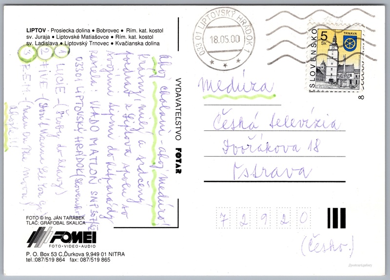 Liptov 3/9 Pokud chcete vidět pohlednice ve vyšším rozlišení nebo zobrazovat jejich zadní stranu, tak se prosím nejdříve přihlašte Přihlásit Zaregistrovat Liptov LIPTOV- Prosiecka dolina- Bobrovec- Rím. kat. kostol sv. Juraja- Liptovské Matiašovce- Rím. kat. kostol Liptovský Trnovec- Kvačianska dolina Jazyk tištěného textu na pohlednici: slovenština Kvačianska dolina, Chráněné území, Kvačany 234, Kvačany, Žilinský kraj, Slovensko ukázat na mapě V blízkém okolí místa zobrazeného na pohlednici lze najít 3 jiné pohlednice. Zobrazit blízké pohlednice Vydavatel: FOTAR (Slovensko) Odhadované datum vydání pohlednice: 1997 - 2000 Pomozte nám zpřesnit rok vzniku pohlednice Velikost (š x v) a tvar pohlednice: 148 x 106 mm (5.83" x 4.17"), obdélník Osoby spjaté s touto pohlednicí: Ing. Jan Tarábek(Autor fotografie) Prošlá poštou:Datum na razítku: 18.5.2000 Ceny: Vyplacené známky: 5,00 Sk (SKK) DiskuseVložit příspěvek Přidat novou složku ... Spravovat složky ...