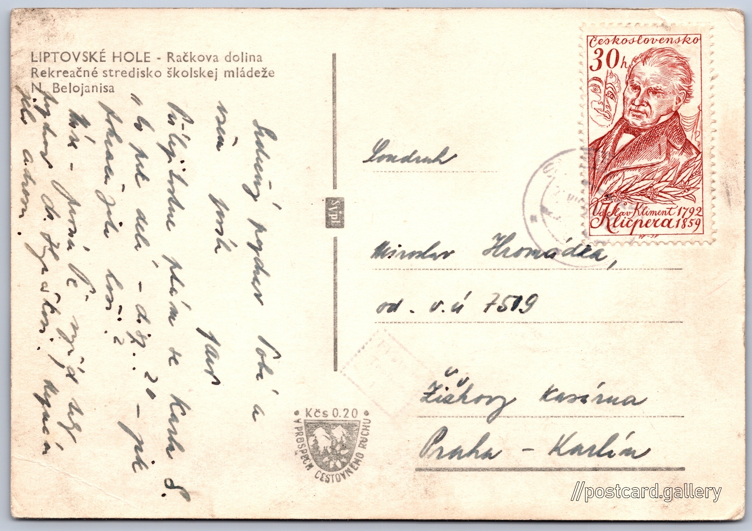 Liptovské Hole, Račkova dolina Pokud chcete vidět pohlednice ve vyšším rozlišení nebo zobrazovat jejich zadní stranu, tak se prosím nejdříve přihlašte Přihlásit Zaregistrovat LIPTOVSKÉ HOLE - Račkova dolinaRekreačné stredisko školskej mládeže N. Belojanisa Jazyk tištěného textu na pohlednici: slovenština Horská Chata OREŠNICA, Račkova dolina 301, Jamník, Žilinský kraj, Slovensko ukázat na mapě V blízkém okolí místa zobrazeného na pohlednici lze najít 2 jiné pohlednice. Zobrazit blízké pohlednice Vydavatel: VPL (Československo) Odhadované datum vydání pohlednice: 1955 - 1960 Pomozte nám zpřesnit rok vzniku pohlednice Velikost (š x v) a tvar pohlednice: 147 x 102 mm (5.79" x 4.02"), obdélník Prošlá poštou Ceny: Příplatek na tur. ruch: 0,20 Kčs (CSK))Vyplacené známky: 0,30 Kčs (CSK) DiskuseVložit příspěvek Přidat novou složku ... Spravovat složky ...