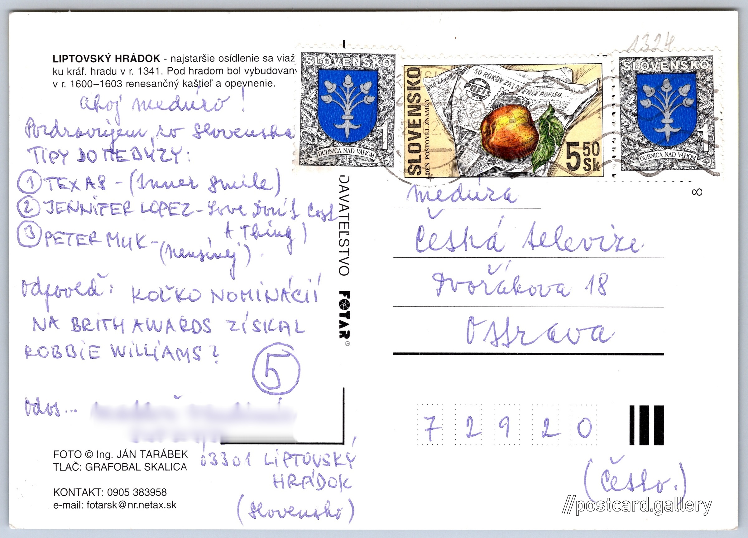 Liptovský Hrádok Pokud chcete vidět pohlednice ve vyšším rozlišení nebo zobrazovat jejich zadní stranu, tak se prosím nejdříve přihlašte Přihlásit Zaregistrovat Liptovský Hrádok LIPTOVSKÝ HRÁDOK - najstaršie osídlenie sa viaže ku kráľ. hradu v r. 1341. Pod hradom bol vybudovan v r. 1600-1603 renesančný kaštieľ a opevnenie. Jazyk tištěného textu na pohlednici: slovenština ČSA 28 ukázat na mapě Vydavatel: FOTAR (Slovensko) Odhadované datum vydání pohlednice: 1998 - 2001 Pomozte nám zpřesnit rok vzniku pohlednice Velikost (š x v) a tvar pohlednice: 148 x 105 mm (5.83" x 4.13"), obdélník Osoby spjaté s touto pohlednicí: Ing. Jan Tarábek(Autor fotografie) Prošlá poštou:Datum na razítku: 22.2.2001 Ceny: Vyplacené známky: 7,50 Sk (SKK) DiskuseVložit příspěvek Přidat novou složku ... Spravovat složky ...