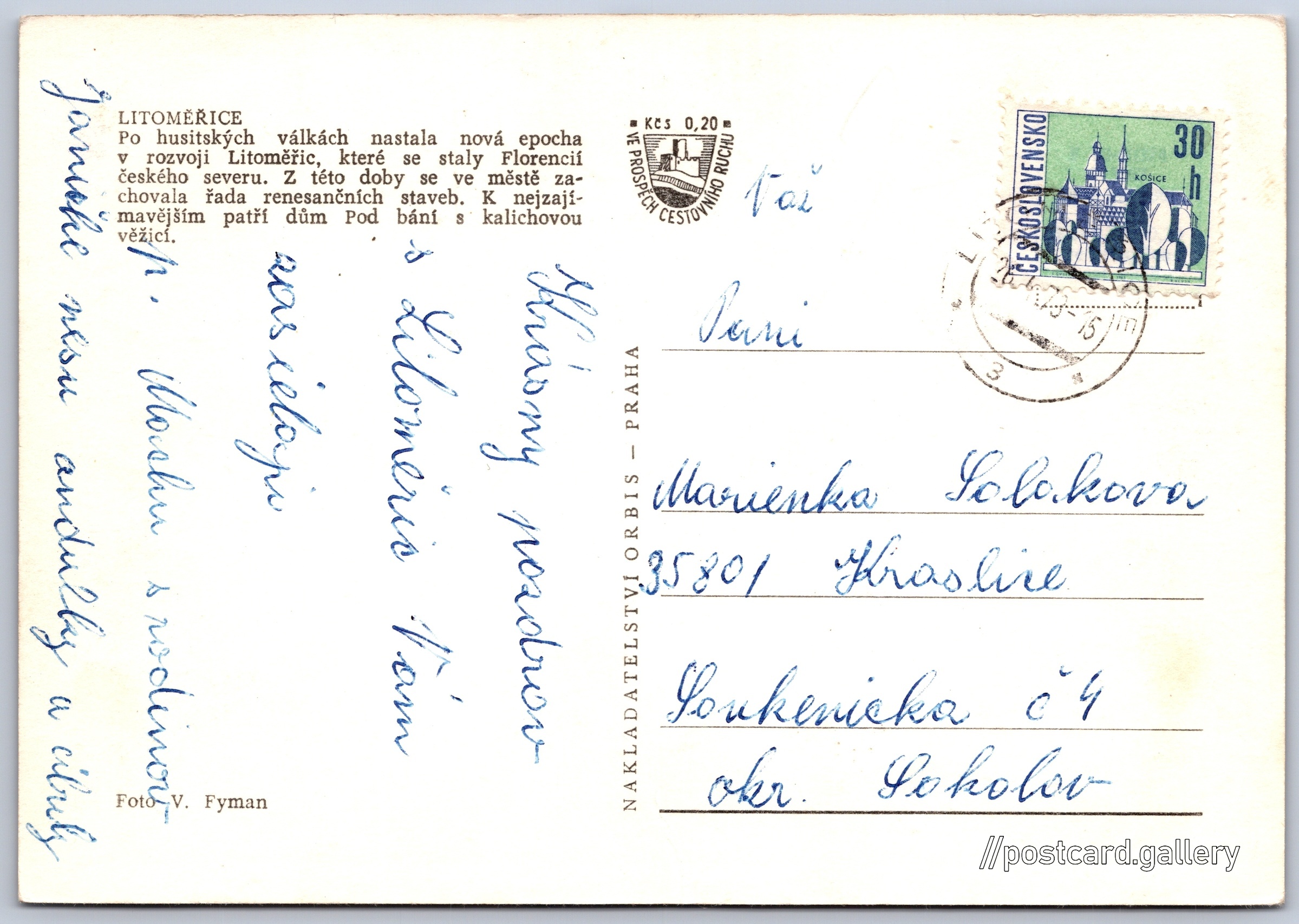 Litoměřice, dům Pod bání Pokud chcete vidět pohlednice ve vyšším rozlišení nebo zobrazovat jejich zadní stranu, tak se prosím nejdříve přihlašte Přihlásit Zaregistrovat LITOMĚŘICEPo husitských válkách nastala nová epocha v rozvoji Litoměřic, které se staly Florencií českého severu. Z této doby se ve městě zachovala řada renesančních staveb. K nejzajímavějším patří dům Pod bání s kalichovou věžicí. Jazyk tištěného textu na pohlednici: čeština Dům Kalich, Historická budova, Mírové náměstí 15/7, Litoměřice-Město, Česko ukázat na mapě V blízkém okolí místa zobrazeného na pohlednici lze najít 7 jiných pohlednic. Zobrazit blízké pohlednice Vydavatel: Nakladatelství Orbis (Československo) Odhadované datum vydání pohlednice: 1970 - 1973 Pomozte nám zpřesnit rok vzniku pohlednice Velikost (š x v) a tvar pohlednice: 148 x 103 mm (5.83" x 4.06"), obdélník Osoby spjaté s touto pohlednicí: Vladimír Fyman(Autor fotografie) Prošlá poštou:Datum na razítku: 26.4.1973 Ceny: Příplatek na tur. ruch: 0,20 Kčs (CSK))Vyplacené známky: 0,30 Kčs (CSK) DiskuseVložit příspěvek Přidat novou složku ... Spravovat složky ...