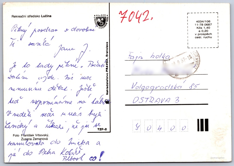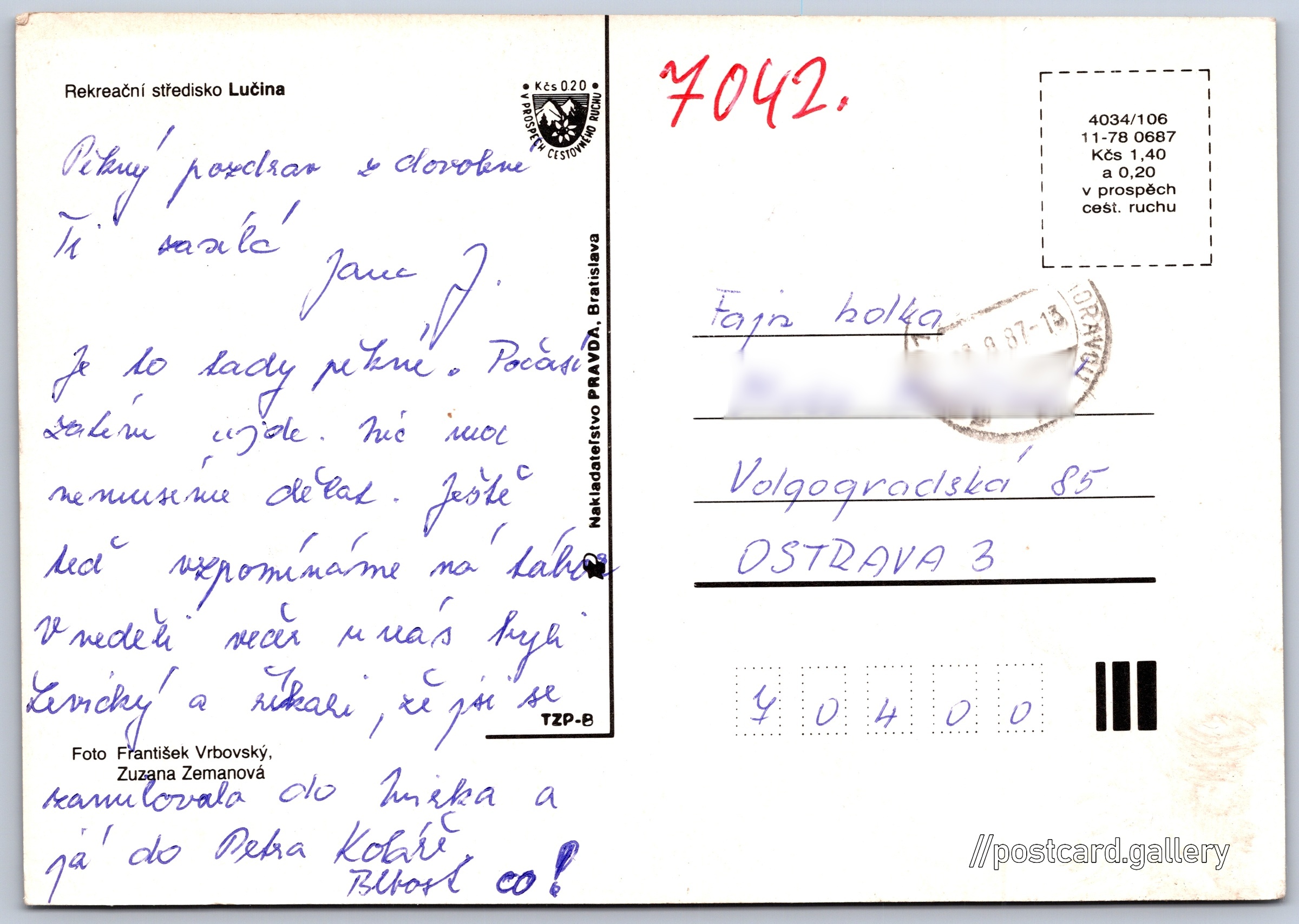 Lučina Pokud chcete vidět pohlednice ve vyšším rozlišení nebo zobrazovat jejich zadní stranu, tak se prosím nejdříve přihlašte Přihlásit Zaregistrovat Lučina Rekreační středisko Lučina Jazyk tištěného textu na pohlednici: čeština Tvarožná Lhota 330, Tvarožná Lhota, 696 62, Hodonín ukázat na mapě Vydavatel: Nakladateľstvo PRAVDA, Bratislava (Československo) Rok vydání pohlednice: červen, 1987 Velikost (š x v) a tvar pohlednice: 150 x 105 mm (5.91" x 4.13"), obdélník Osoby spjaté s touto pohlednicí: František Vrbovský(Autor fotografie) Zuzana Zemanová(Autor fotografie) Prošlá poštou:Datum na razítku: 13.8.1987 Ceny: Cena pohlednice: 1,40 Kčs (CSK) (+0,20 Kčs přípl. na tur. ruch) Kódy na pohlednici: 4034/106 11-78 0687 DiskuseVložit příspěvek Přidat novou složku ... Spravovat složky ...