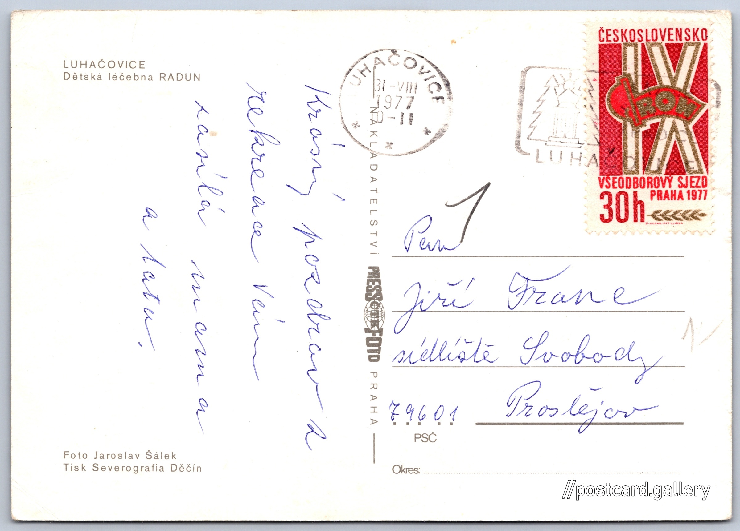 Luhačovice, dětská léčebna Radun Pokud chcete vidět pohlednice ve vyšším rozlišení nebo zobrazovat jejich zadní stranu, tak se prosím nejdříve přihlašte Přihlásit Zaregistrovat LUHAČOVICEDětská léčebna RADUN Jazyk tištěného textu na pohlednici: čeština Boutique hotel RADUN****, Bílá čtvrť 447, Luhačovice, Česko ukázat na mapě V blízkém okolí místa zobrazeného na pohlednici lze najít 29 jiných pohlednic. Zobrazit blízké pohlednice Vydavatel: PressFoto Praha (Československo) Odhadované datum vydání pohlednice: 1974 - 1977 Pomozte nám zpřesnit rok vzniku pohlednice Velikost (š x v) a tvar pohlednice: 148 x 105 mm (5.83" x 4.13"), obdélník Osoby spjaté s touto pohlednicí: Jaroslav Šálek(Autor fotografie) Prošlá poštou:Datum na razítku: 31.8.1977 Ceny: Vyplacené známky: 0,30 Kčs (CSK) DiskuseVložit příspěvek Přidat novou složku ... Spravovat složky ...