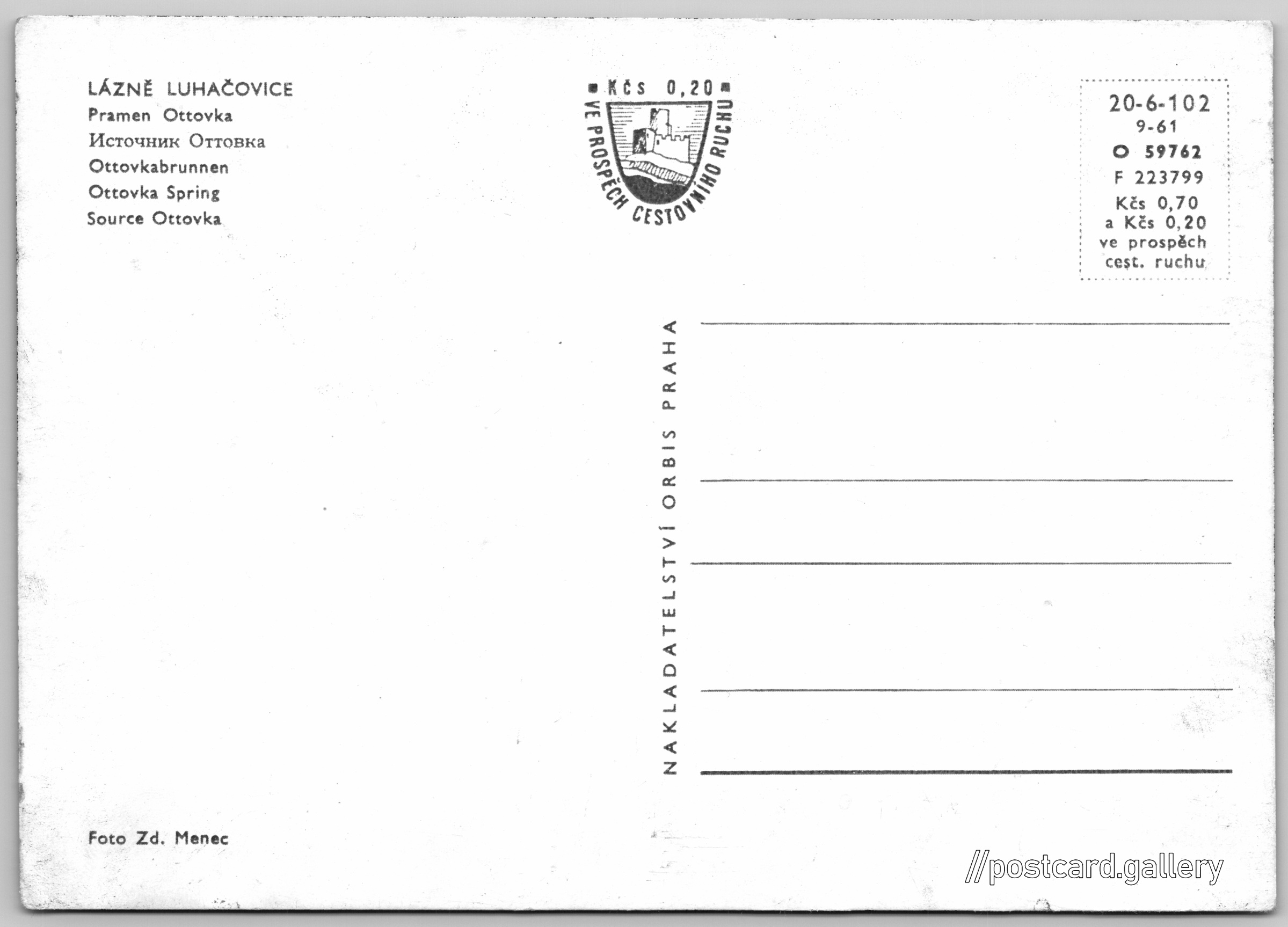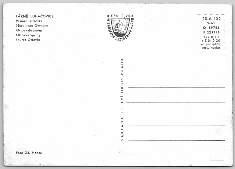 Luhačovice, pramen Ottovka Pokud chcete vidět pohlednice ve vyšším rozlišení nebo zobrazovat jejich zadní stranu, tak se prosím nejdříve přihlašte Přihlásit Zaregistrovat LÁZNĚ LUHAČOVICE- Pramen Ottovka- Источник Оттовка- Ottovkabrunnen- Ottovka Spring- Source Ottovka Jazyky tištěného textu na pohlednici: čeština, ruština, němčina, angličtina, francouzština, francouzština Ottovka, Minerální pramen, Luhačovice, Česko ukázat na mapě V blízkém okolí místa zobrazeného na pohlednici lze najít 29 jiných pohlednic. Zobrazit blízké pohlednice Vydavatel: Nakladatelství Orbis (Československo) Rok vydání pohlednice: září, 1961 Velikost (š x v) a tvar pohlednice: 148 x 105 mm (5.83" x 4.13"), obdélník Osoby spjaté s touto pohlednicí: Zdeněk Menec(Autor fotografie) Čistá pohlednice (neprošlá poštou) Ceny: Cena pohlednice: 0,70 Kčs (CSK) (+0,20 Kčs přípl. na tur. ruch) Kódy na pohlednici: 20-6-102 9-61 O 59762 F 223799 DiskuseVložit příspěvek Přidat novou složku ... Spravovat složky ...