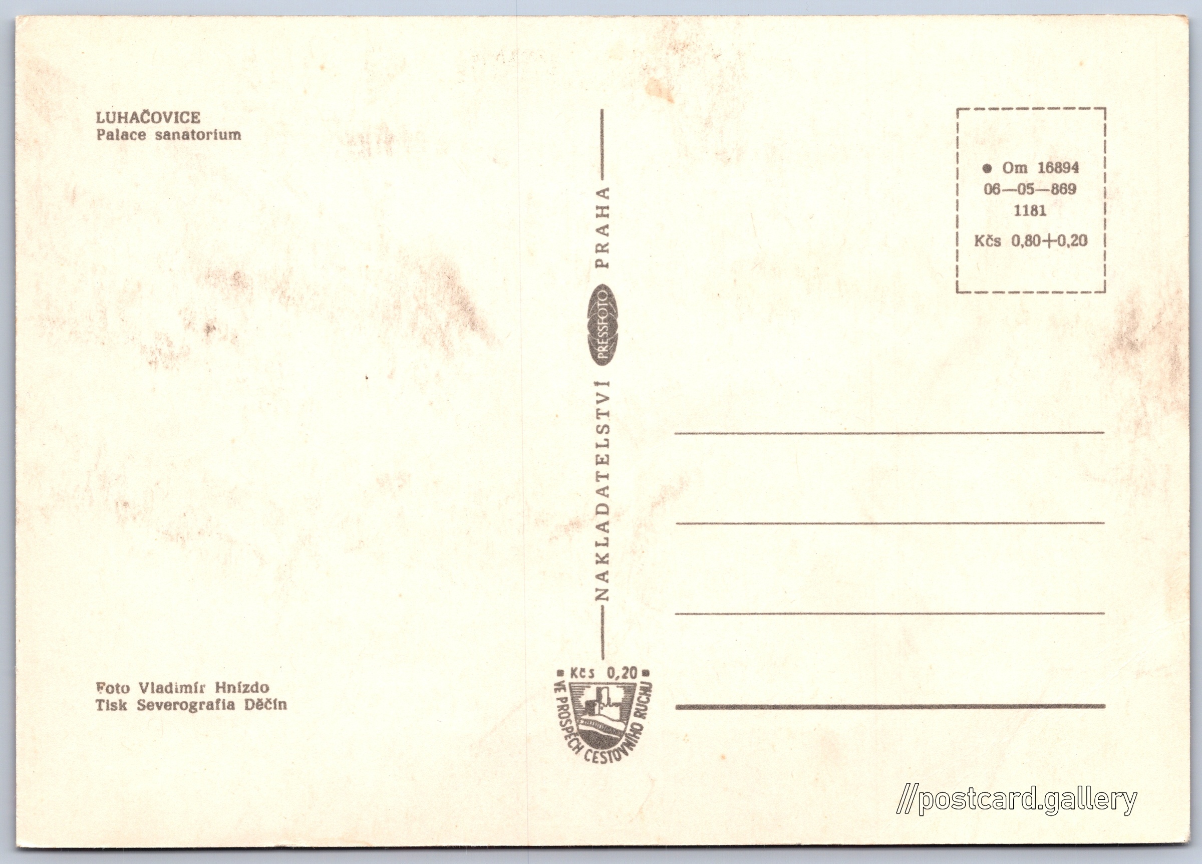 Luhačovice, sanatorium Palace 3/29 Pokud chcete vidět pohlednice ve vyšším rozlišení nebo zobrazovat jejich zadní stranu, tak se prosím nejdříve přihlašte Přihlásit Zaregistrovat LUHAČOVICEPalace sanatorium Jazyk tištěného textu na pohlednici: čeština Masarykova, Luhačovice, Zlín ukázat na mapě V blízkém okolí místa zobrazeného na pohlednici lze najít 29 jiných pohlednic. Zobrazit blízké pohlednice Vydavatel: PressFoto Praha (Československo) Rok vydání pohlednice: 1968 Velikost (š x v) a tvar pohlednice: 148 x 105 mm (5.83" x 4.13"), obdélník Osoby spjaté s touto pohlednicí: Vladimír Hnízdo(Autor fotografie) Čistá pohlednice (neprošlá poštou) Ceny: Cena pohlednice: 0,80 Kčs (CSK) (+0,20 Kčs přípl. na tur. ruch) Kódy na pohlednici: •Om 16894 06-05-869 1181 DiskuseVložit příspěvek Přidat novou složku ... Spravovat složky ...