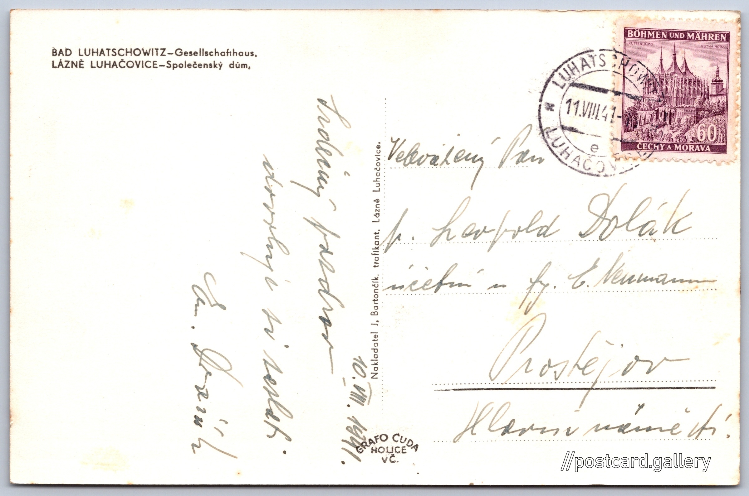 Luhačovice, Společenský dům 9/29 Pokud chcete vidět pohlednice ve vyšším rozlišení nebo zobrazovat jejich zadní stranu, tak se prosím nejdříve přihlašte Přihlásit Zaregistrovat BAD LUHATSCHOWITZ - Gesellschafthaus,LÁZNĚ LUHAČOVICE - Společenský dům, Jazyk tištěného textu na pohlednici: čeština Společenský dům, Historická budova, Lázeňské náměstí 127, Luhačovice, Česko ukázat na mapě V blízkém okolí místa zobrazeného na pohlednici lze najít 29 jiných pohlednic. Zobrazit blízké pohlednice Vydavatel: J, Bartončík, trafikant (Československo) Odhadované datum vydání pohlednice: 1938 - 1941 Pomozte nám zpřesnit rok vzniku pohlednice Velikost (š x v) a tvar pohlednice: 138 x 90 mm (5.43" x 3.54"), obdélník Prošlá poštou:Datum na razítku: 11.8.1941Datum napsání pohledu: 10.8.1941 Ceny: Vyplacené známky: 0,60 Kčs (CSK) DiskuseVložit příspěvek Přidat novou složku ... Spravovat složky ...