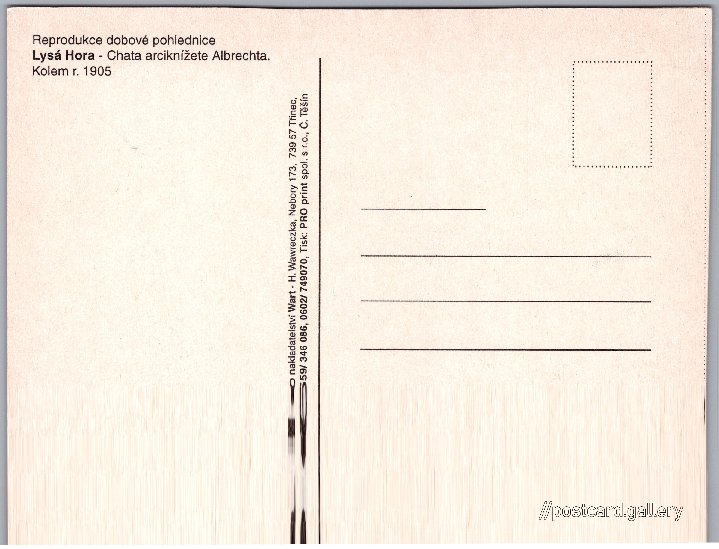Lysá hora, chata arciknížete Albrechta 10/12 Pokud chcete vidět pohlednice ve vyšším rozlišení nebo zobrazovat jejich zadní stranu, tak se prosím nejdříve přihlašte Přihlásit Zaregistrovat Erzherzog Albrecht-Schutzhaus auf der Lysa (1325 m) Reprodukce dobové pohledniceLysá Hora - Chata arciknížete Albrechta.Kolem r. 1905 Jazyk tištěného textu na pohlednici: čeština Lysá hora (1324 m), Hora, výškový bod, Krásná, Moravskoslezský kraj, Česko ukázat na mapě V blízkém okolí místa zobrazeného na pohlednici lze najít 10 jiných pohlednic. Zobrazit blízké pohlednice Datum vydání není známo Pomozte nám odhadnout datum vzniku pohlednice Velikost (š x v) a tvar pohlednice: 153 x 115 mm (6.02" x 4.53"), obdélník Čistá pohlednice (neprošlá poštou) DiskuseVložit příspěvek Přidat novou složku ... Spravovat složky ...